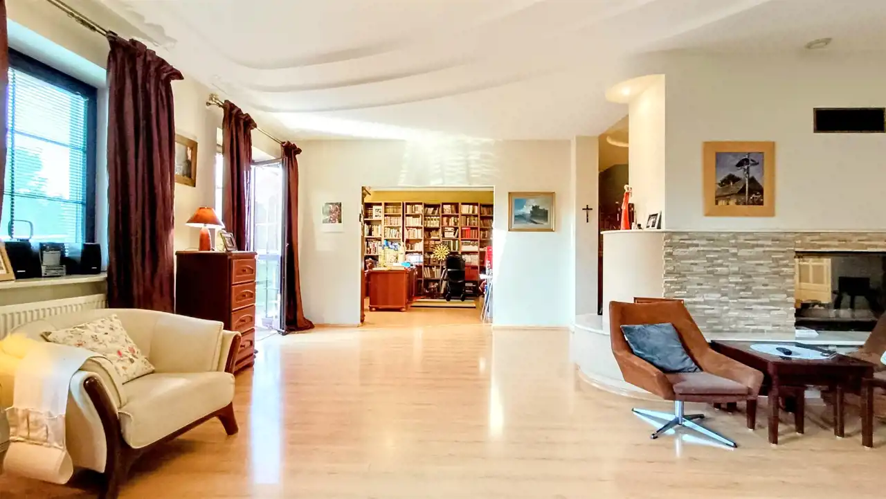 - przestronny hall [15,8 m2] prowadzący do salonu z dwustronnym kominkiem [41,4 m2], gabinetu z biblioteką [18,8 m2] oraz dwoma wyjściami - jednym na taras z urządzonym miejscem do grillowania oraz drugim wychodzącym na ogród