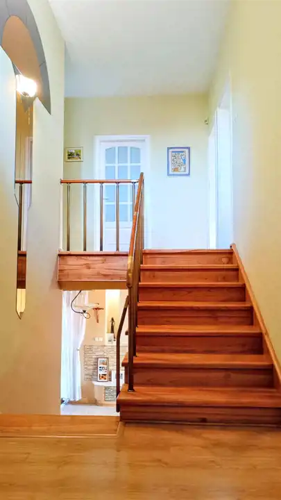- wiatrołap [5,3 m2] z garderobą [3,1 m2] prowadzący do pomieszczeń na parterze i klatki schodowej do piwnicy oraz na piętro