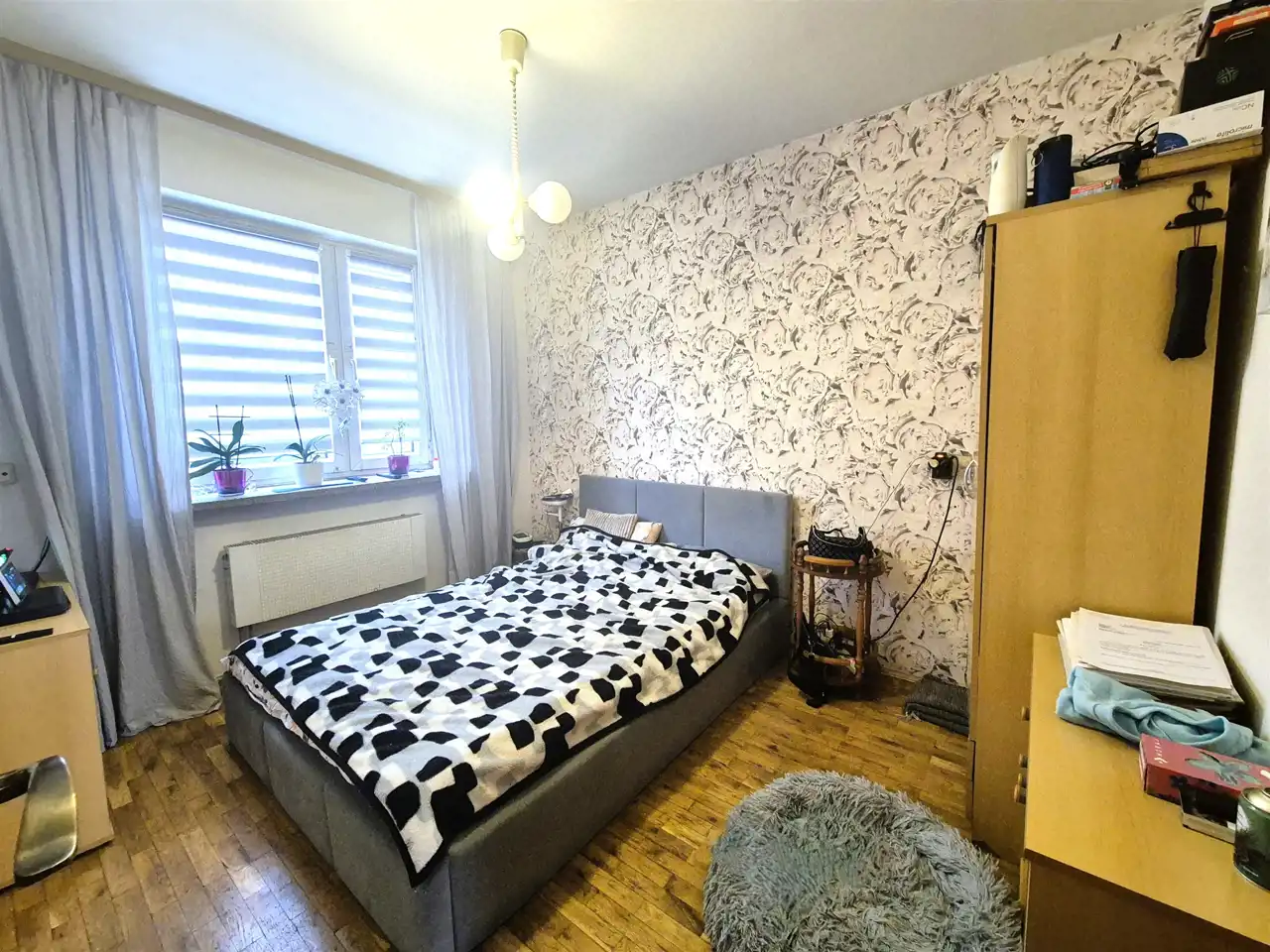 na podłogach drewniany parkiet oraz w kuchni i łazience – płytki,