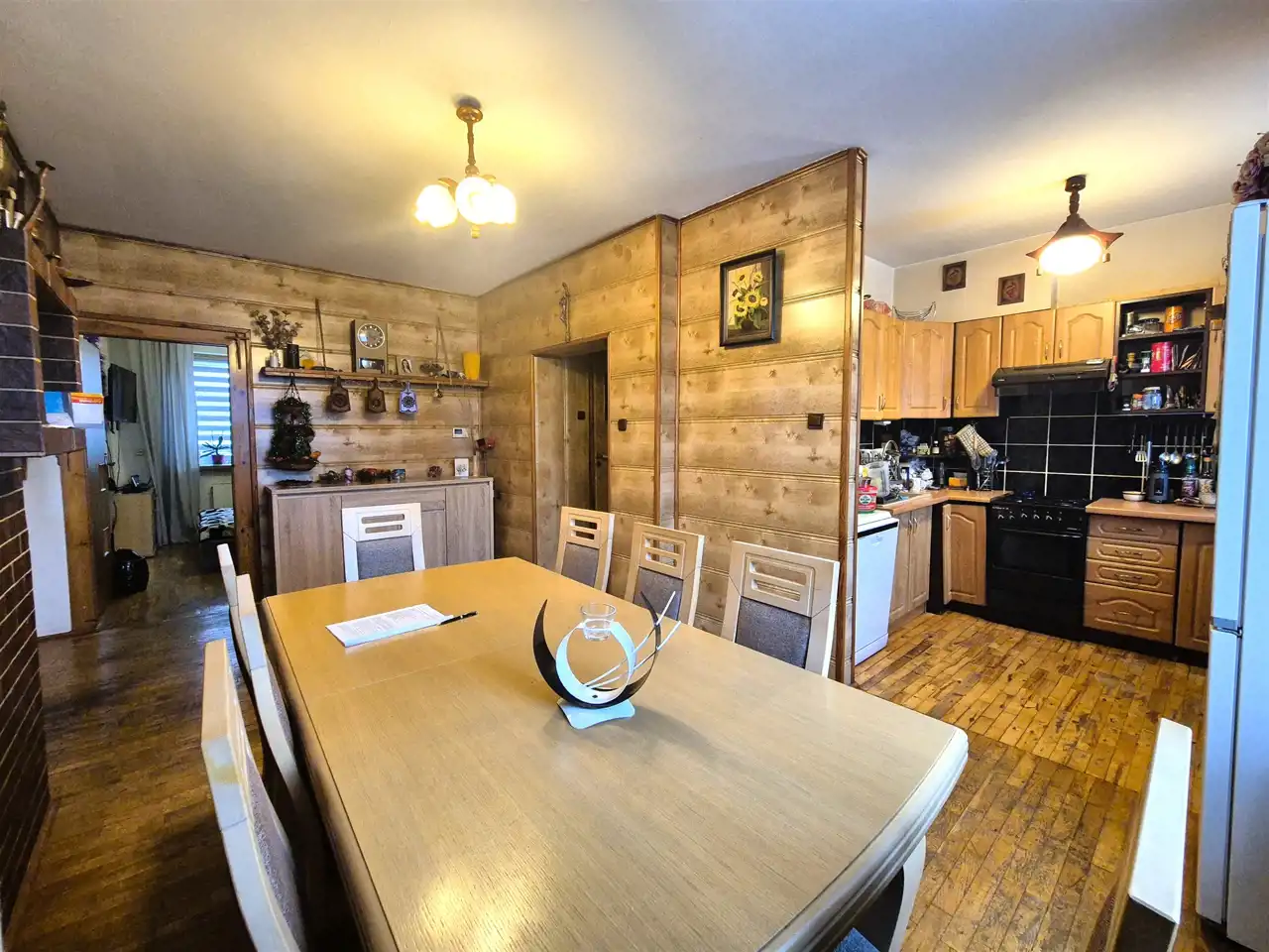 * piętro: 3 ustawne pokoje, w tym dwa z wyjściem na balkon, duża kuchnia, łazienka, WC oraz przedpokój,