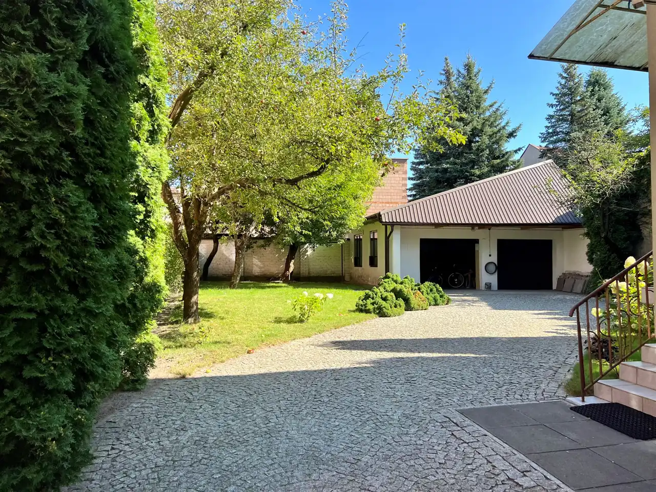 teren w całości ogrodzony z licznymi nasadzeniami drzew i krzewów ozdobnych,