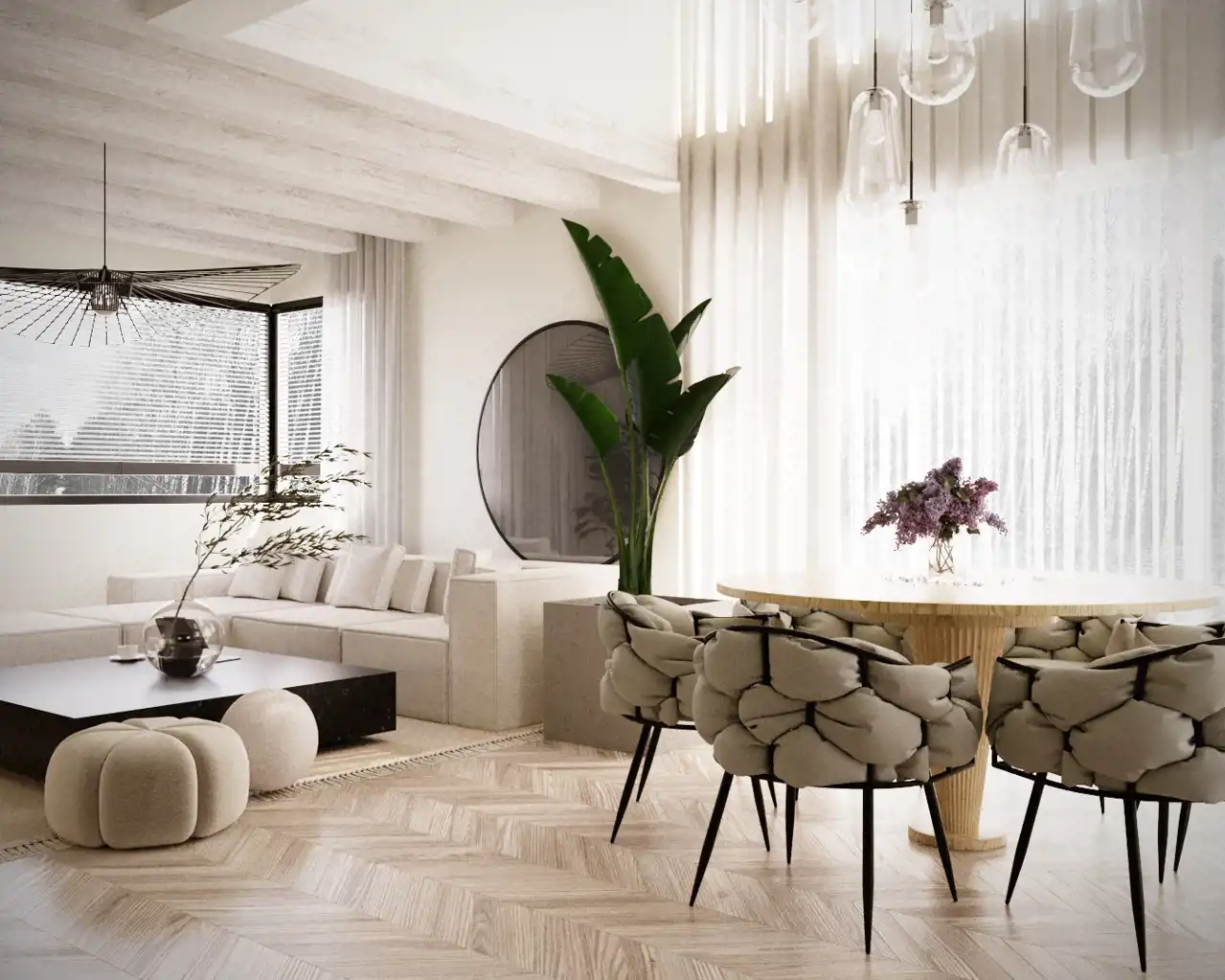 Na parterze znajduje się wiatrołap (7,3 m2), salon z aneksem kuchennym o łącznej powierzchni 56 m2 z dużymi oknami przechodzącymi na piętro dzięki otwartej przestrzeni, z widokiem na brzozowy lasek. Na parterze znajduje się również gabinet (10 m2), toaleta (3 m2) oraz garaż z kotłownią (42 m2) połączone z domem wejściem przez wiatrołap.