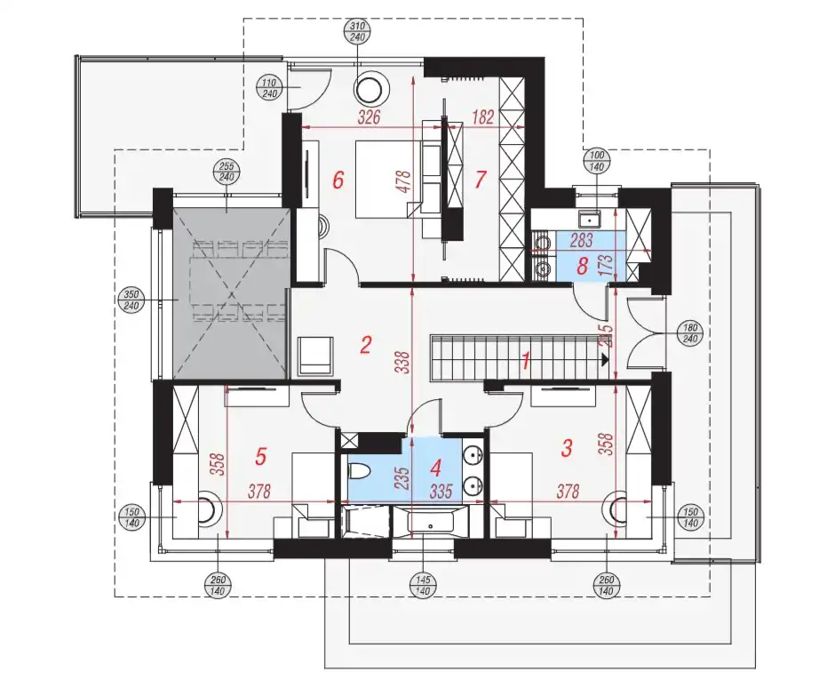 Na piętro prowadzą schody usytuowane w centralnej części domu. Na górze do pokoi prowadzi przestronny korytarz (17,8 m2) znajdziemy tu 3 sypialnie (15,5 m2 + garderoba 8 m2, 13,2 m2 i 13,2 m2), łazienkę (7 m2) oraz pralnię (4,6 m2)