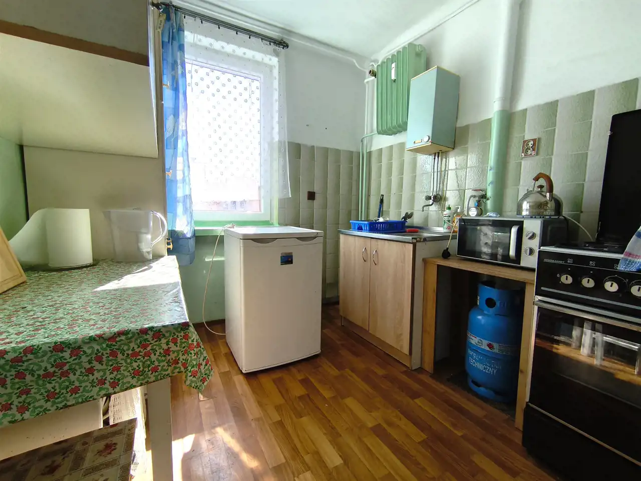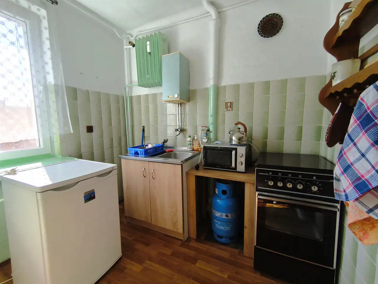 ogrzewanie z sieci miejskiej, ciepła woda z boilera elektrycznego, gaz z butli,