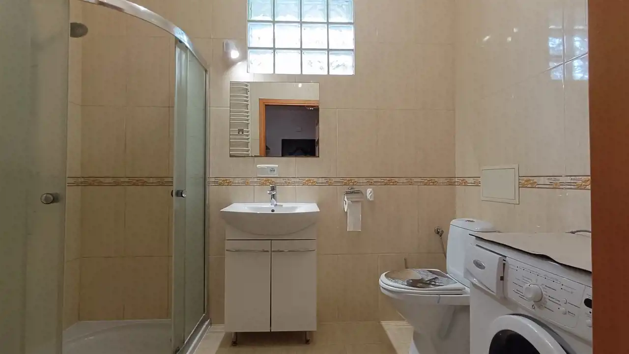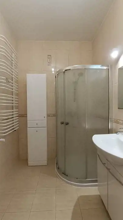 - łazienka z prysznicem, umywalką, pralką oraz WC
