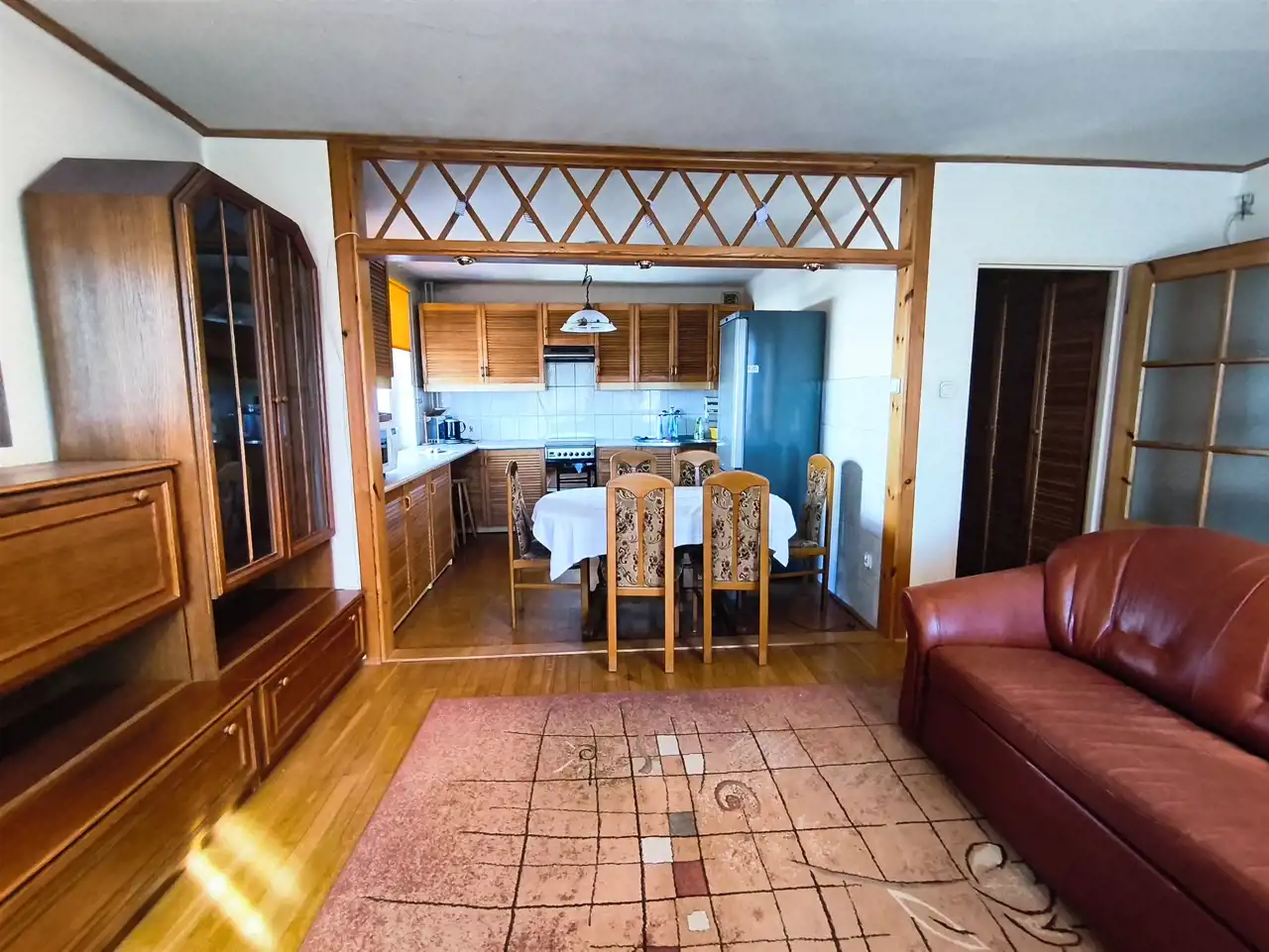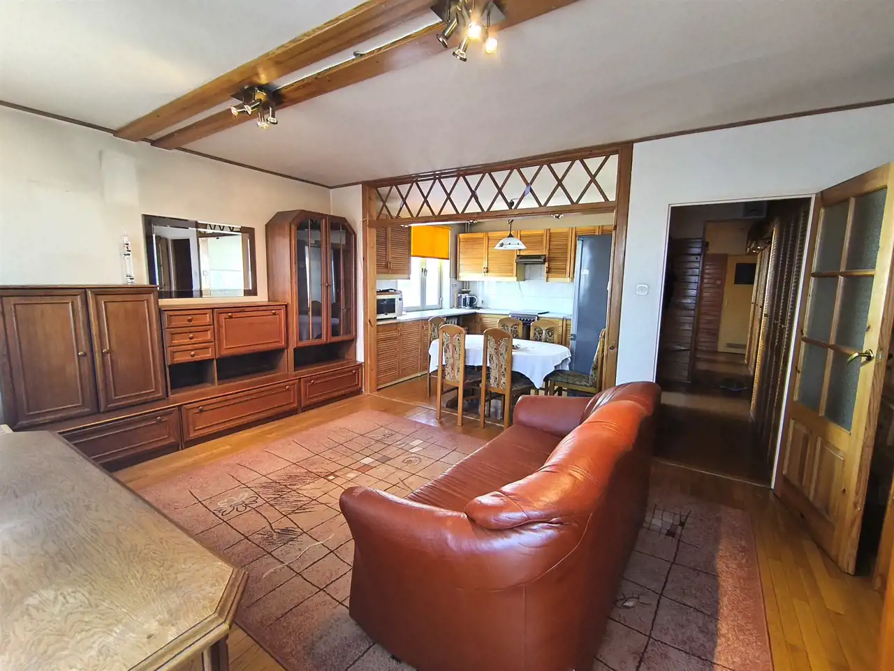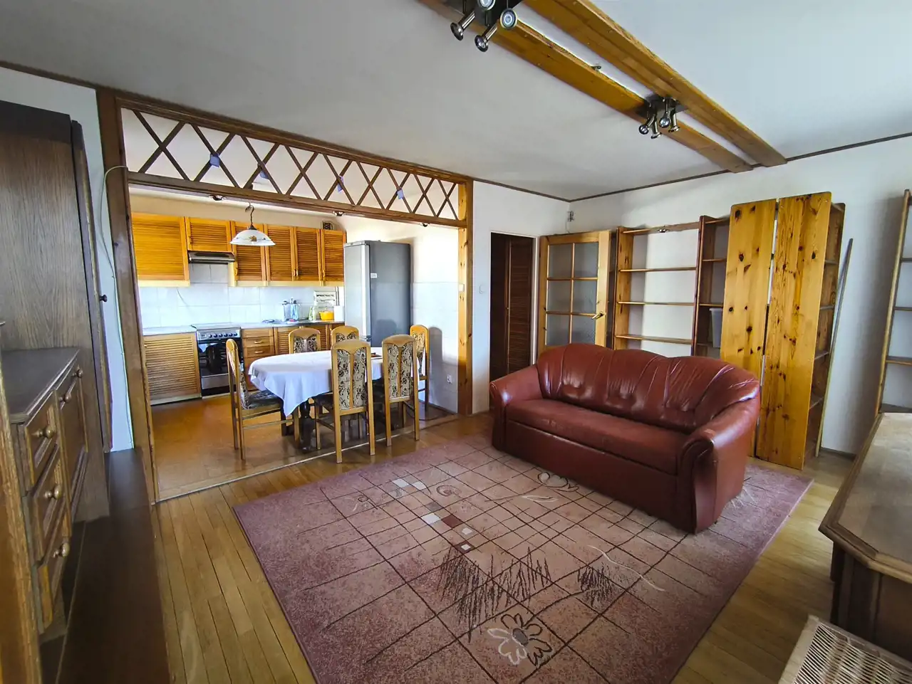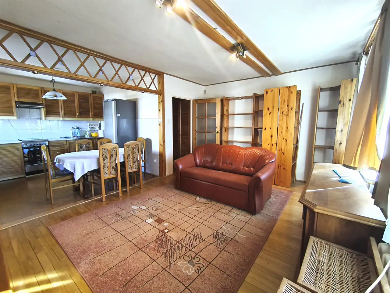 * duży salon z otwartą kuchnią oraz wyjściem na balkon,