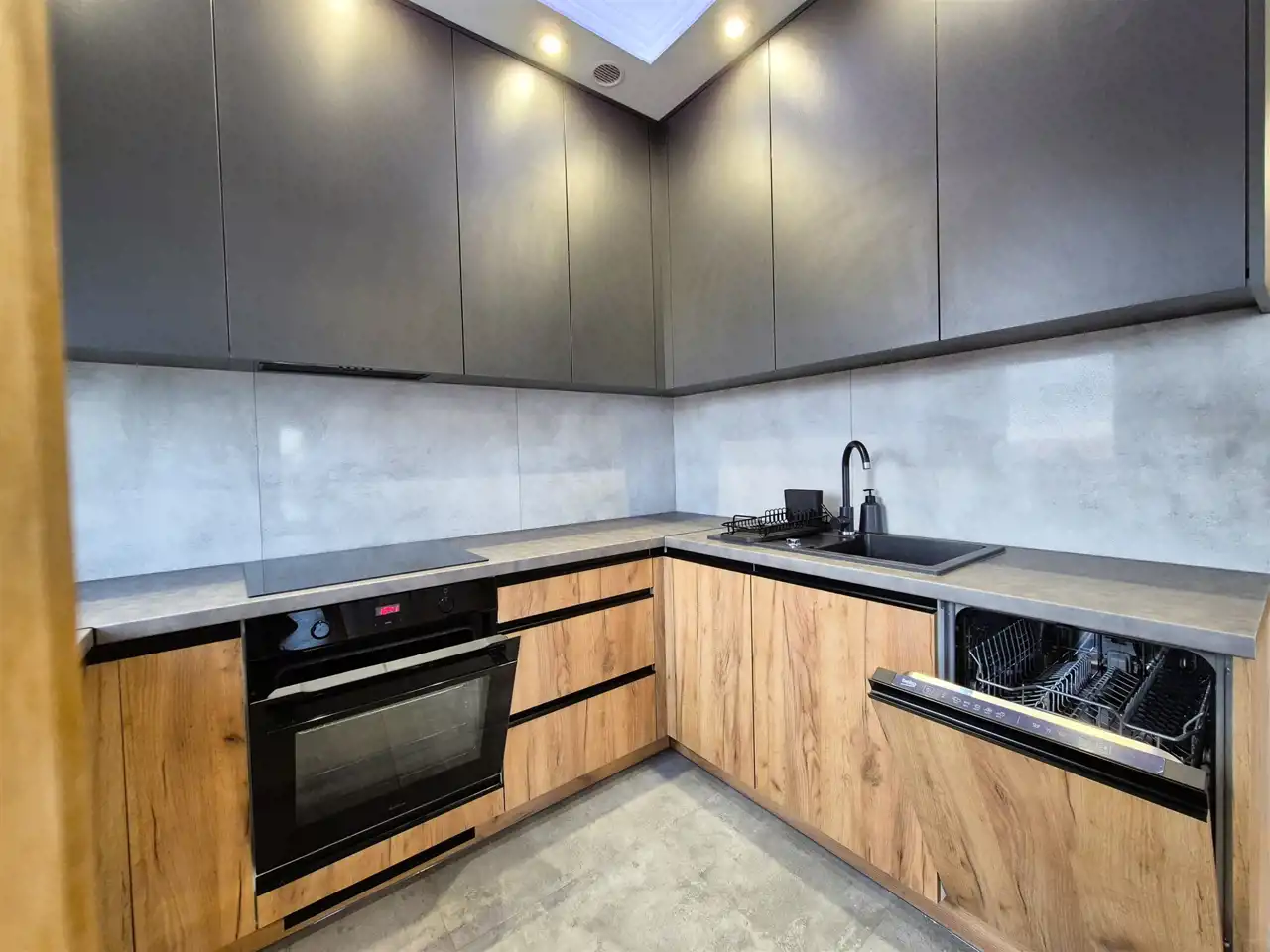 * aneks kuchenny z elegancką, bardzo funkcjonalną zabudową meblową oraz wysokiej klasy sprzętem AGD - lodówka z zamrażarką, zmywarka, płyta indukcyjna, piekarnik,