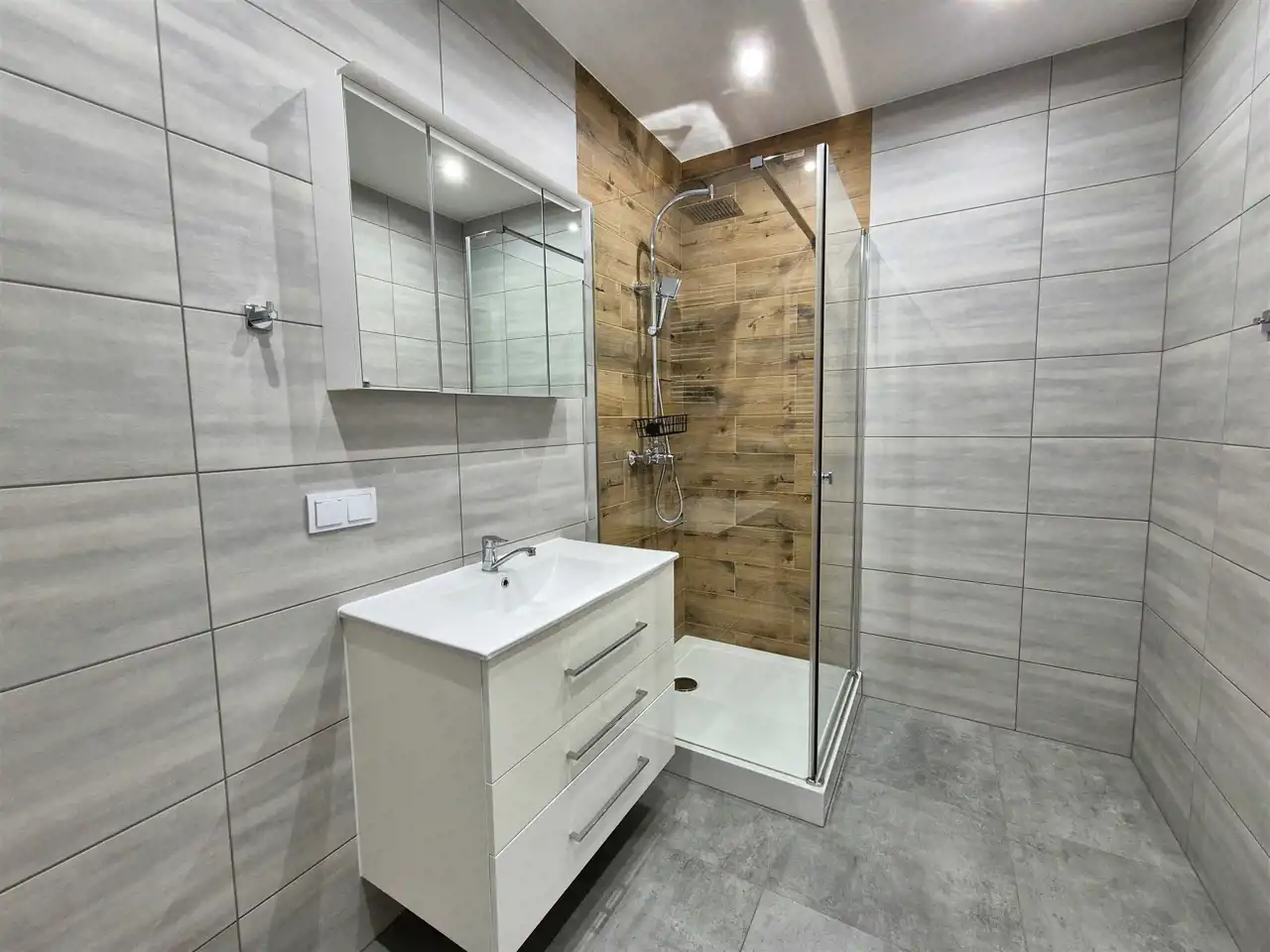 * łazienka z WC wyposażona w prysznic z deszczownicą, umywalkę z szafką podumywalkową oraz lustro,
