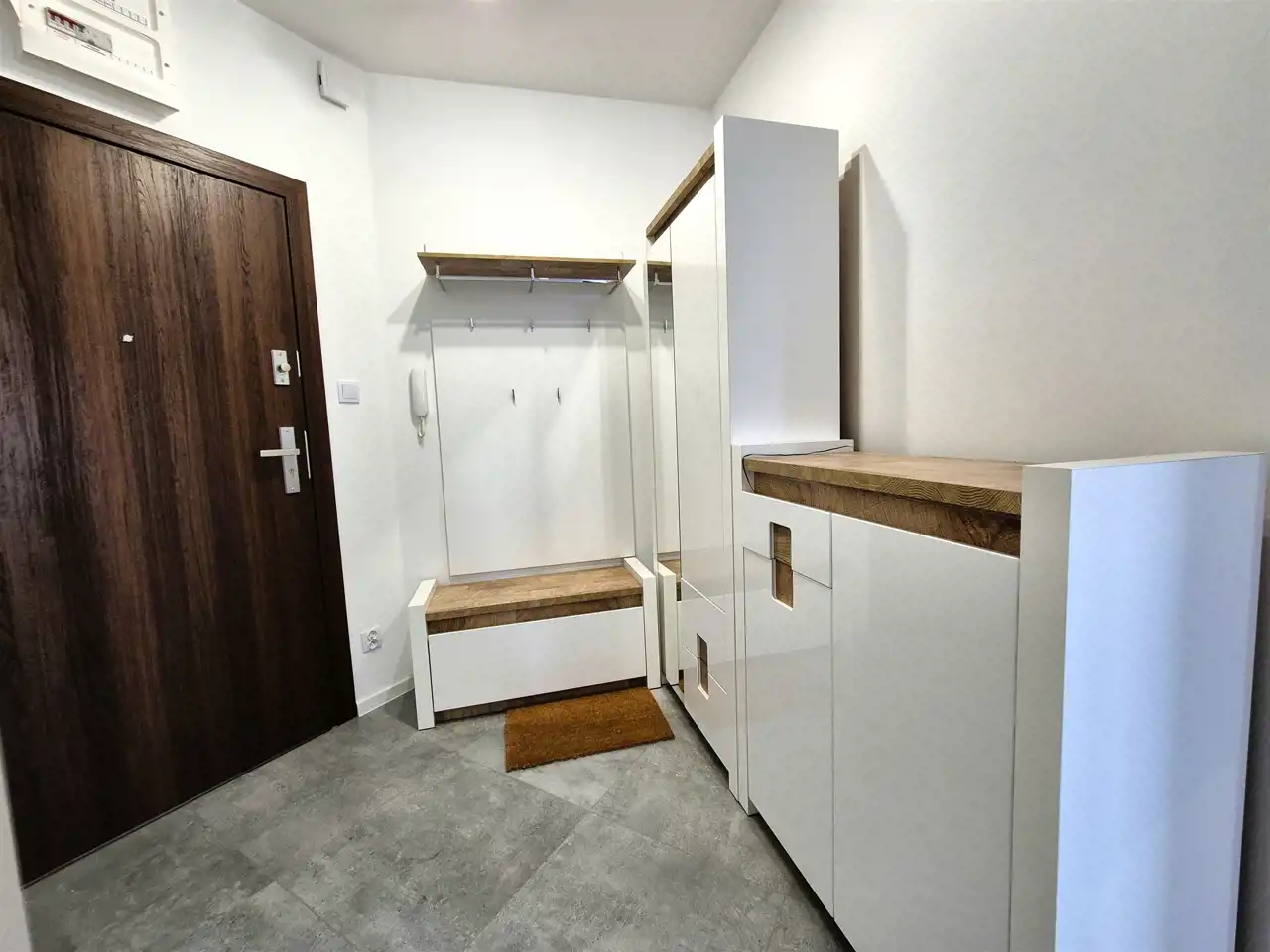 * przedpokój z praktycznymi szafkami oraz wieszakami na odzież wierzchnią, tworzący praktyczne i uporządkowane miejsce do codziennego użytkowania,
