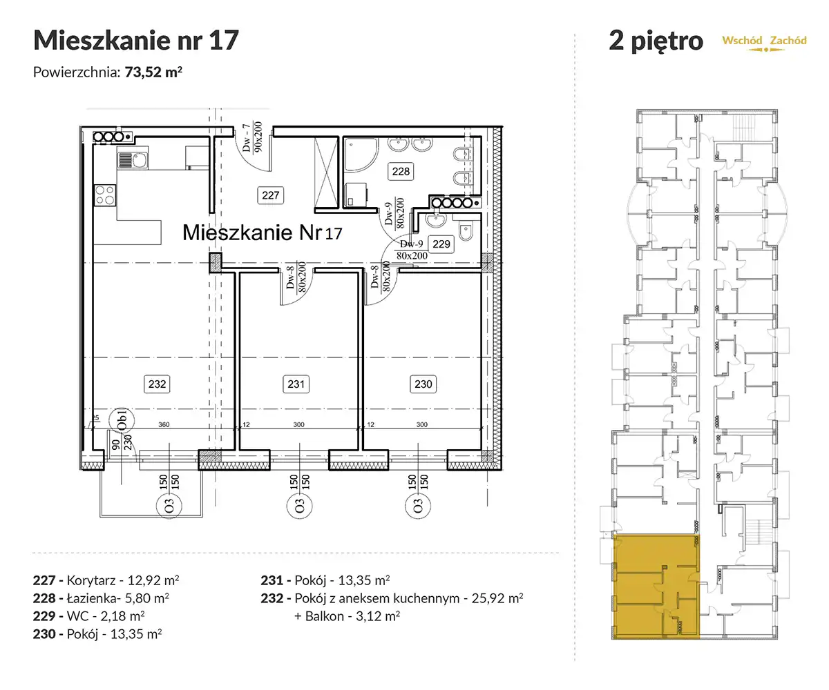 - Charakterystyka mieszkania 73.52 m2, 3 pokoje