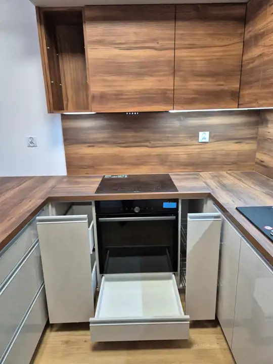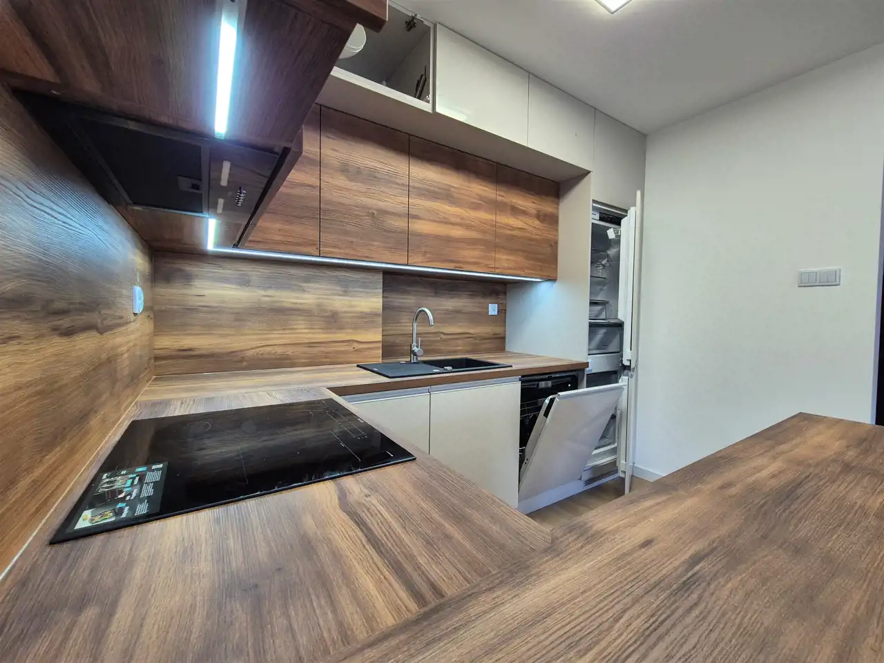 * aneks kuchenny z elegancką, bardzo funkcjonalną zabudową meblową oraz wysokiej klasy sprzętem AGD - lodówka z zamrażarka, zmywarka, płyta indukcyjna, piekarnik,