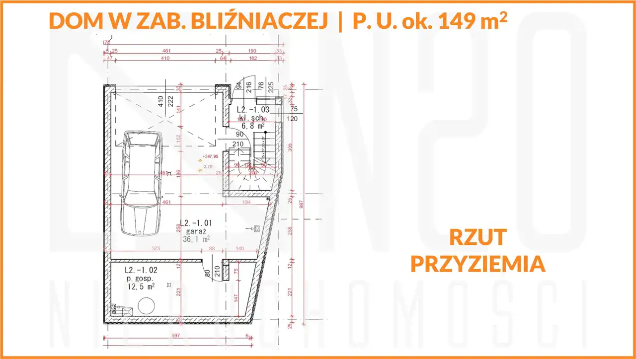 Przyziemie to dwustanowiskowy garaż, dwa pomieszczenia gospodarcze i klatka schodowa.