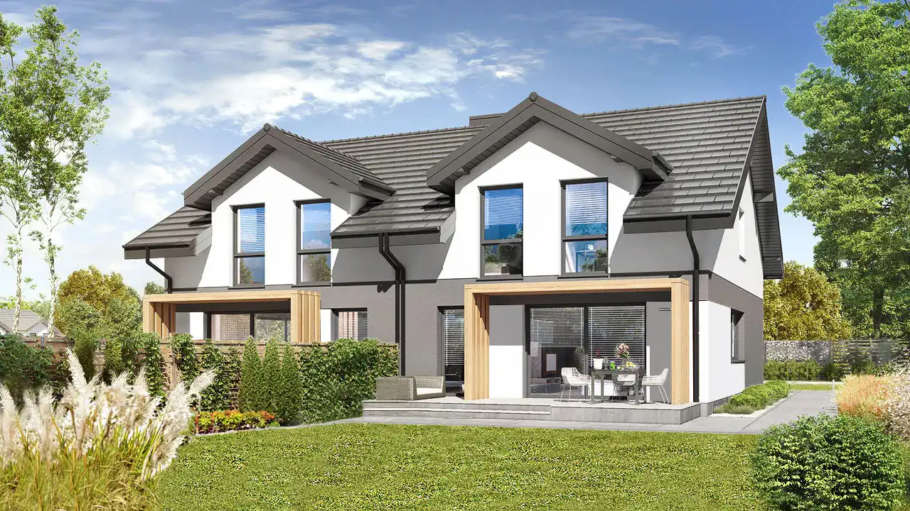 N20 Nieruchomości oferuje do sprzedaży nowoczesny dom w zabudowie bliźniaczej (każdy dom budowany na niezależnych ścianach) na zagospodarowanej i ogrodzonej działce. Dojazd do domów drogą gminną. Inwestycja znajduje się w Trąbkach- 20 min. od Krakowa, a usytuowanie domów wśród zieleni, gwarantuje ciszę i spokój. Zalety inwestycji: bardzo dobry dojazd do Karkowa i Wieliczki; w pobliżu sklepy, szkoła, przedszkola, punkty usługowe; komunikacja miejska i podmiejska. Powierzchnia całkowita domu wynosi 153 m2 (użytkowa 146 m2), 5 lub 6 pokoi z garażem.