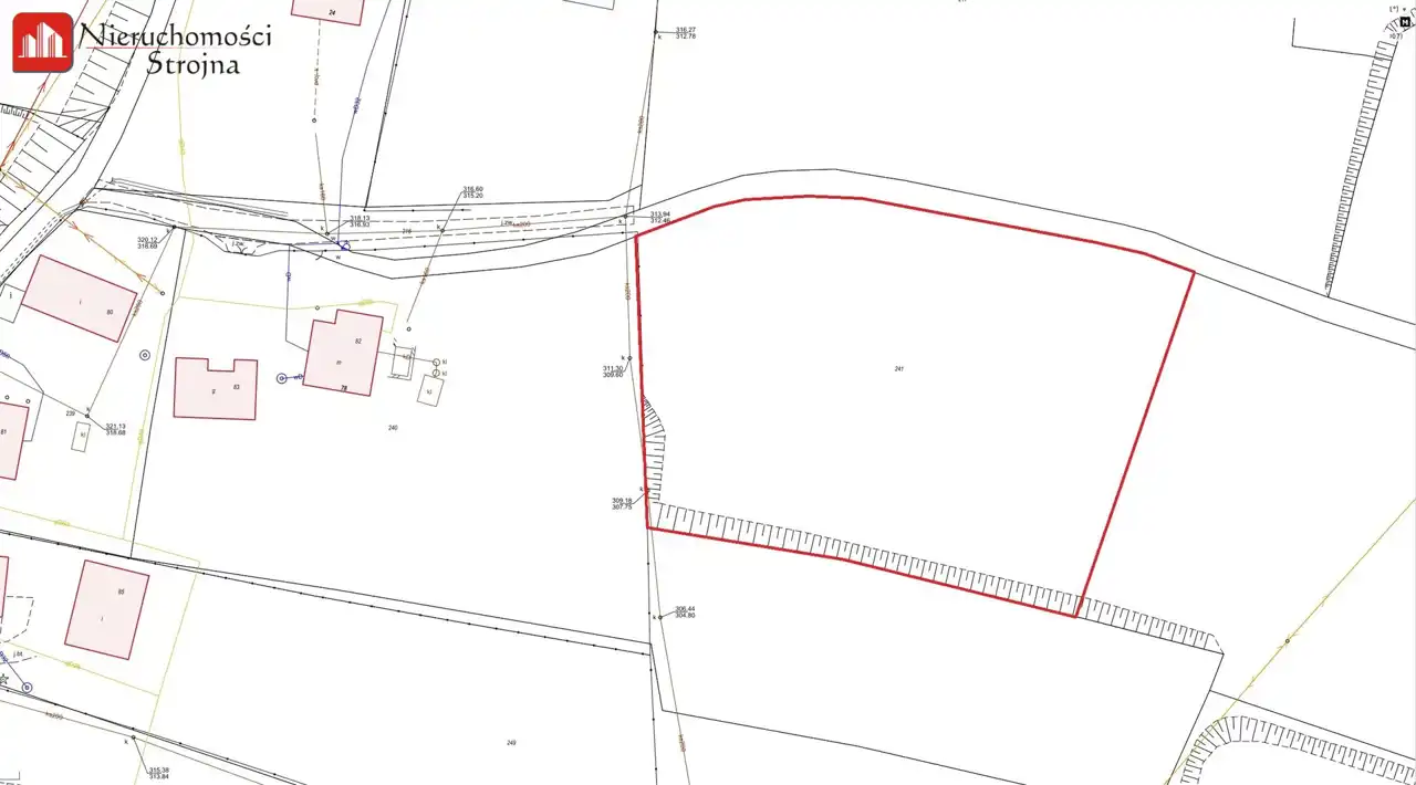 Wymiary działki: ok 74m od drogi gminnej, x 55 m, kształt zwarty, zbliżony do prostokąta, który ułatwia jej zagospodarowanie i umożliwia różnorodne projekty budowlane (kształt w galerii zdjęć).
