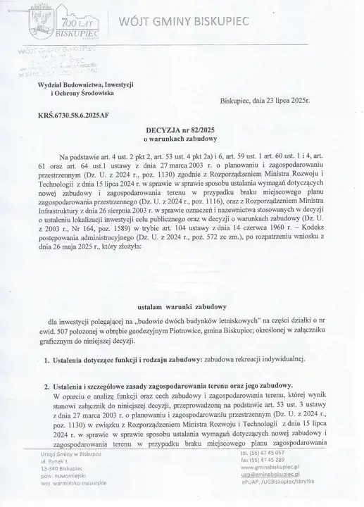 - Na część działki (o niższej klasie bonitacyjnej gruntu) wydano Warunki Zabudowy Nr 82/2025 dwoma (2) budynkami letniskowymi o pow. zabudowy łącznie 200 - 240 m2.