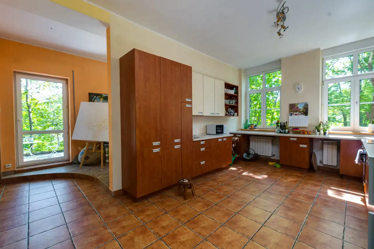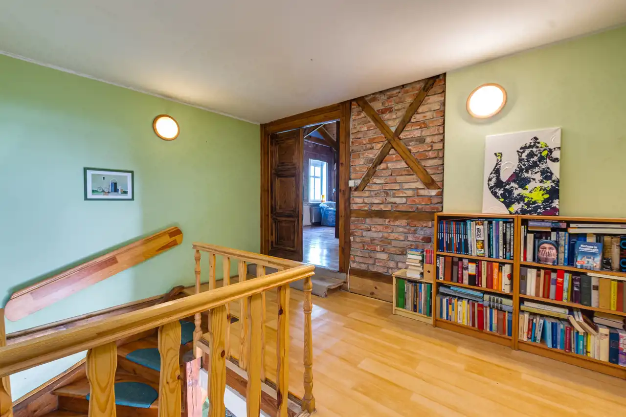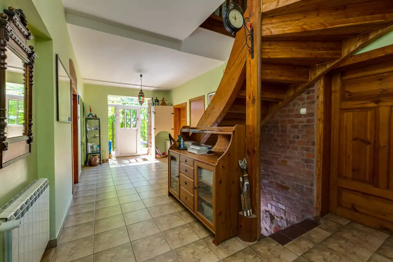 Wnętrze domu zachwyca przestrzenią – wysokie sufity, oryginalne detale architektoniczne, klimatyczna piwniczka idealna na wino lub spiżarnię, a wszystko to otoczone zielenią i ciszą. Na miejscu zainstalowano pompę ciepła oraz instalację fotowoltaiczną, co czyni nieruchomość nowoczesną i przyjazną środowisku. Budynek jest podłączony do gminnej sieci wodno-kanalizacyjnej, co zapewnia wygodę i bezproblemową eksploatację.