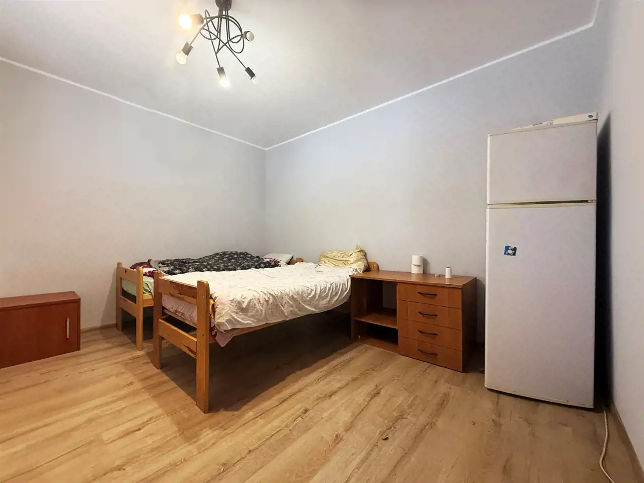 Parter - przedpokój, 4 pokoje sypialniane, mała łazienka wyposażona w kabinę prysznicową oraz kuchnia z jadalnią.