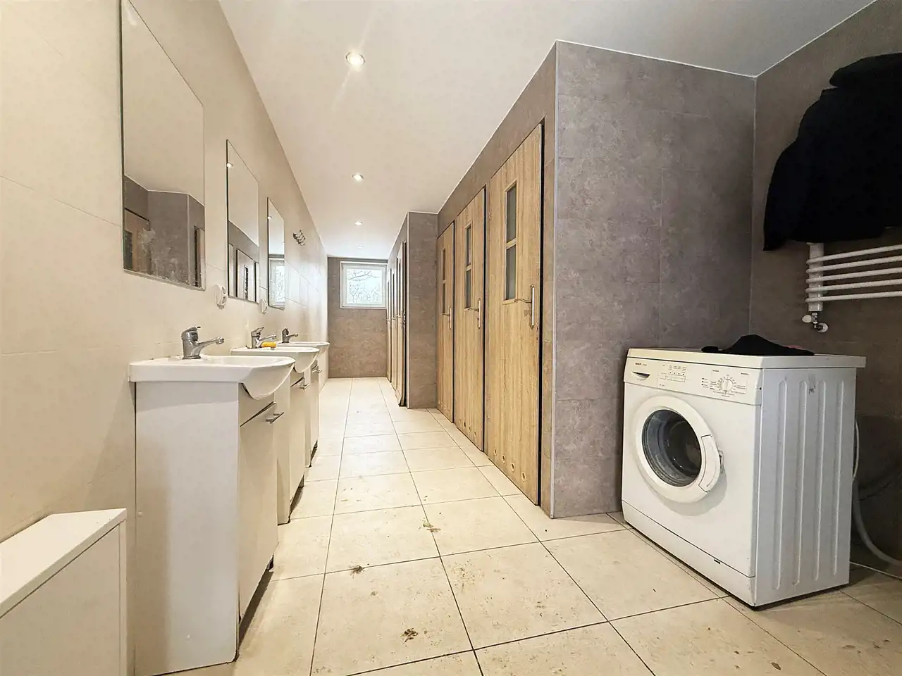 W budynku znajduje się również druga, przestronna łazienka wyposażona w 3 kabiny prysznicowe, 3 toalety, szafki wraz z umywalkami oraz lustra, a także pralki do dyspozycji najemców. Pomieszczenie posiada osobne wejście.