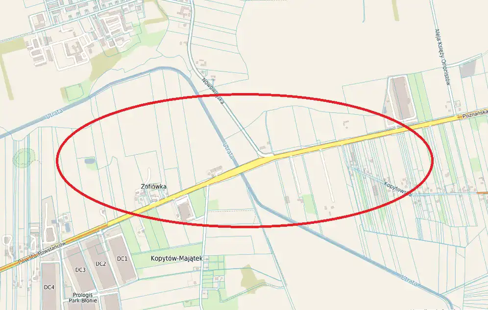 Oferujemy do sprzedaży działkę inwestycyjną o powierzchni 19 900 m2, zlokalizowaną w Kopytowie (gmina Błonie), w pobliżu trasy Warszawa-Poznań.