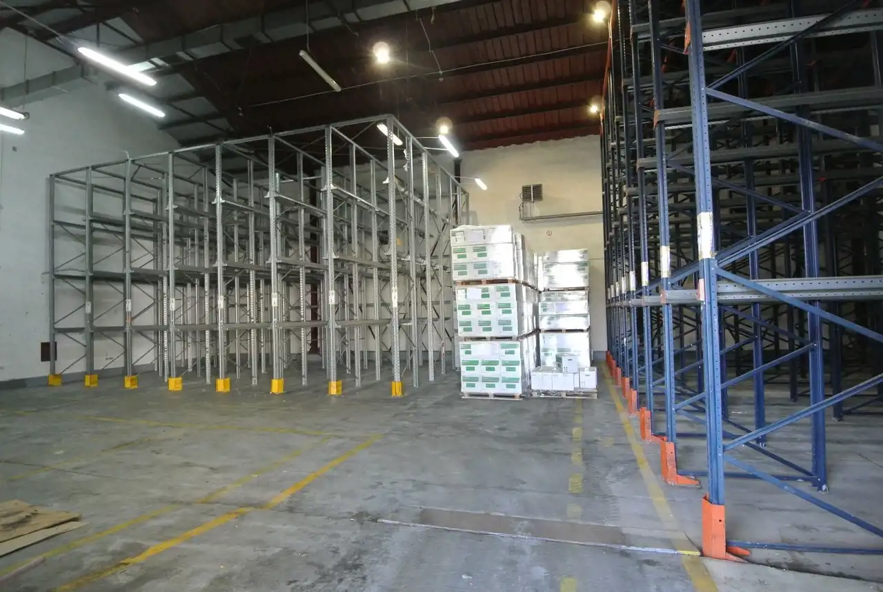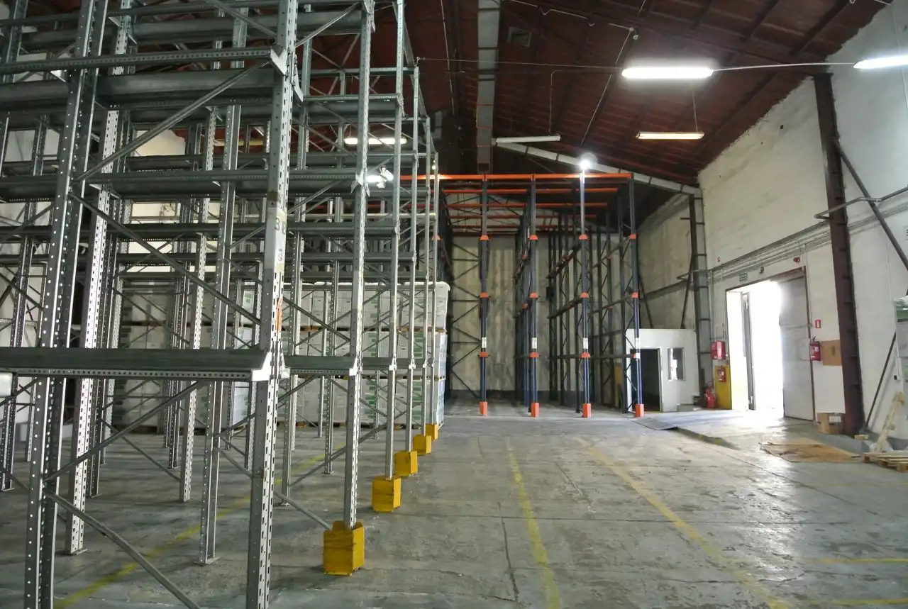 The warehouse is equipped with high-bay pallet racking.