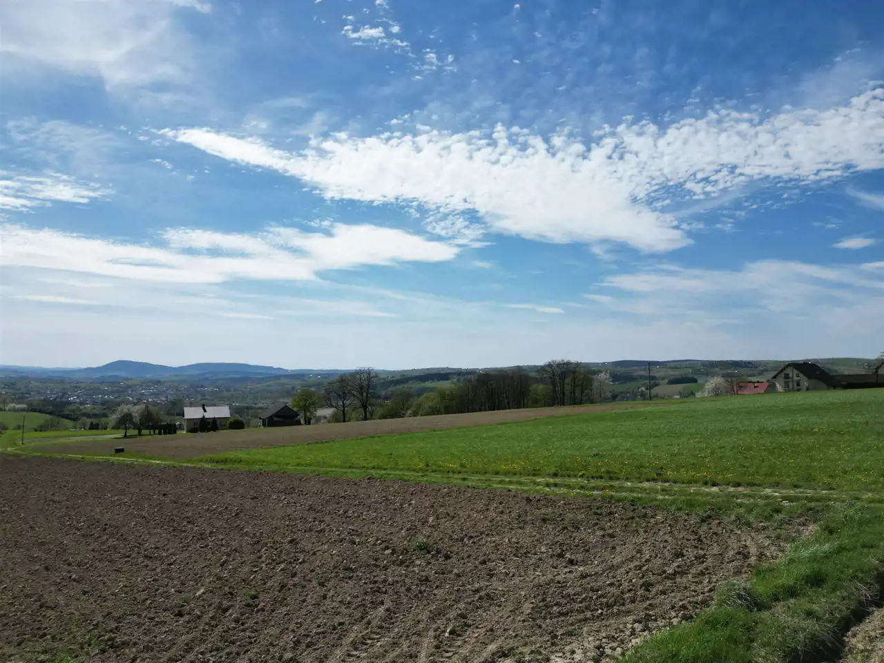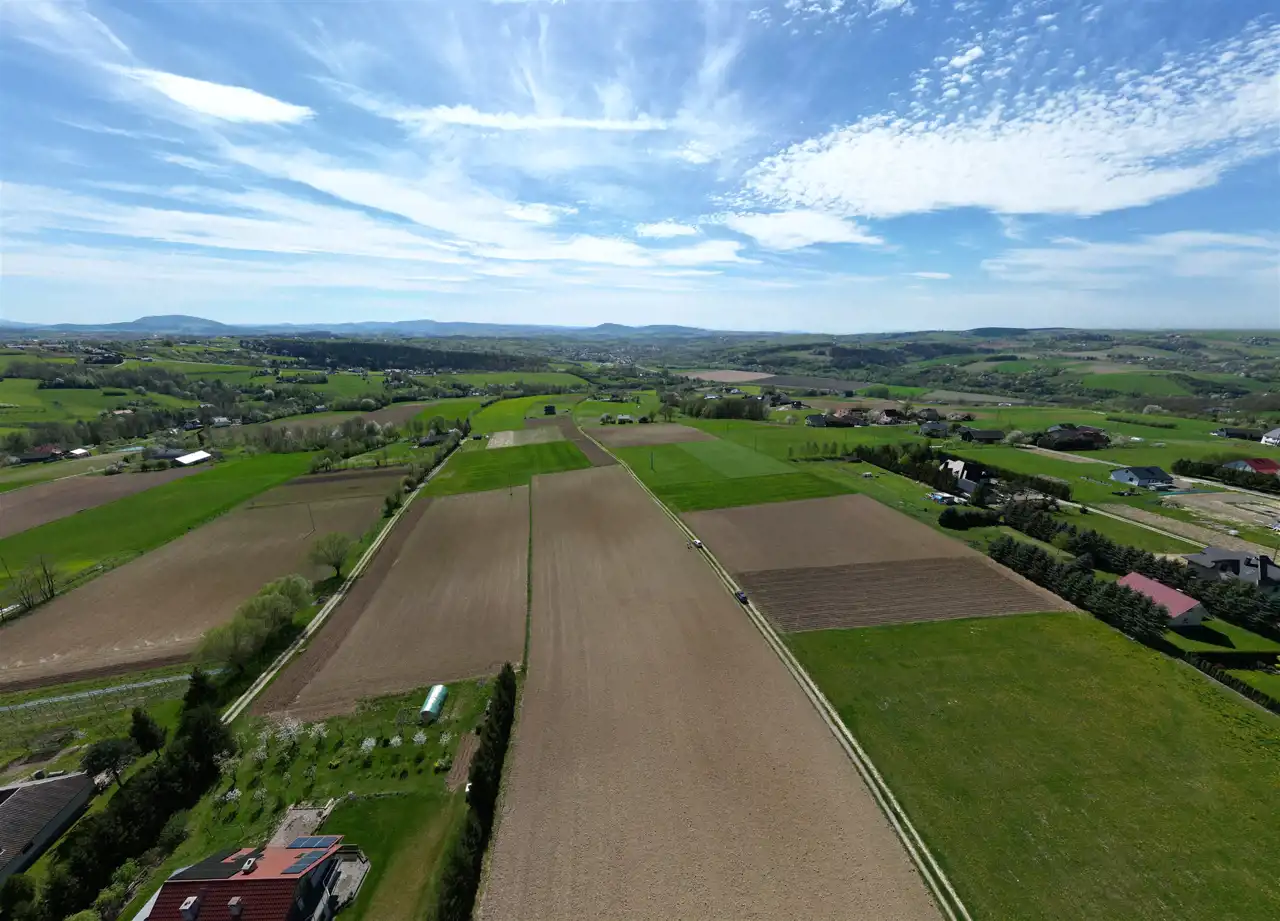 Działki z widokiem na Pogórze Ciężkowickie z delikatnym nachyleniem terenu w kierunku południowo - zachodnim.