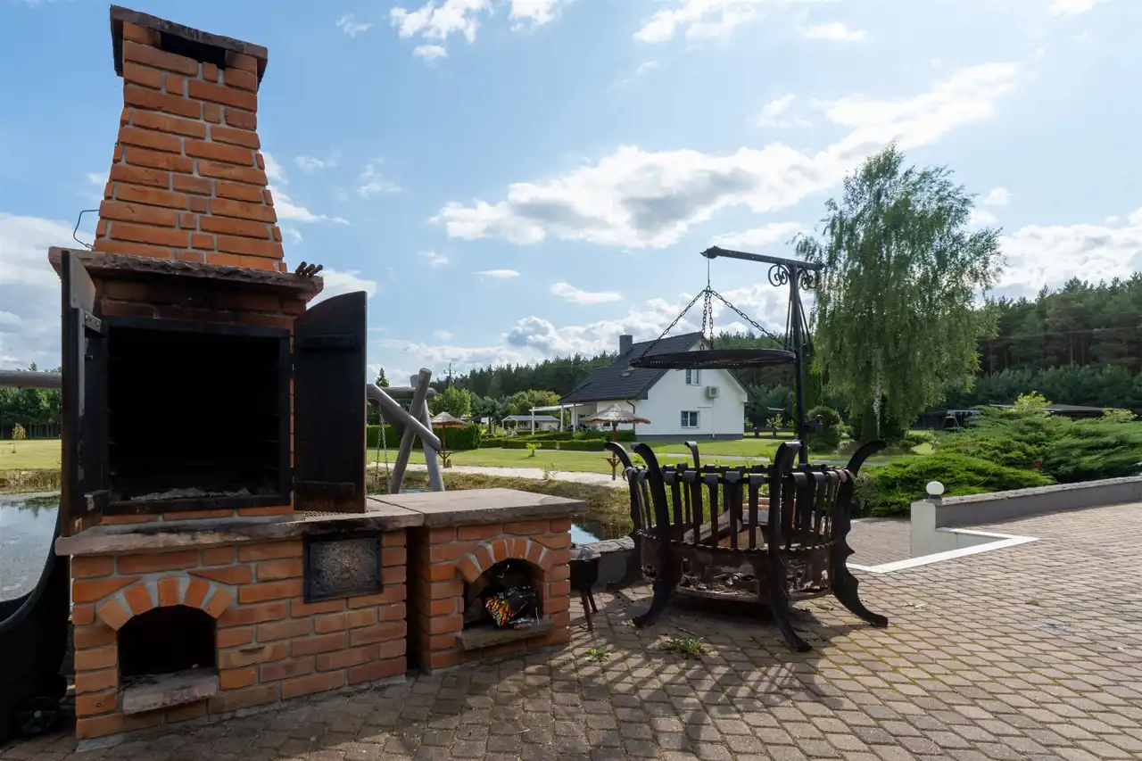 - Zadaszona wiata grillowa, wędzarnia oraz palenisko na ognisko – idealna przestrzeń do spotkań towarzyskich i relaksu na świeżym powietrzu.