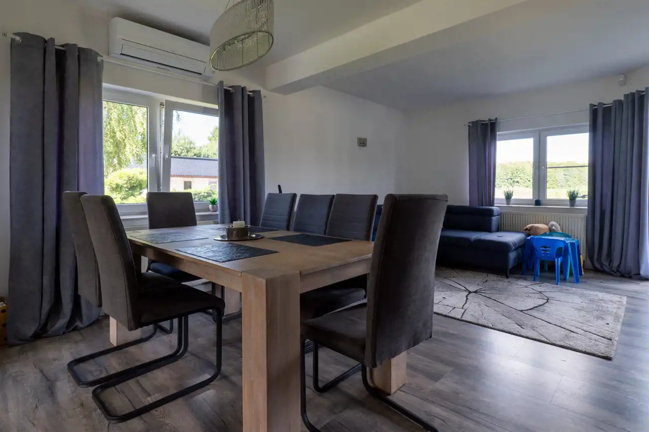 - salon połączony z jadalnią - wyposażony w klimatyzację oraz kominek z płaszczem wodnym, zapewniający nie tylko przytulną atmosferę, ale także dodatkowe źródło ogrzewania,