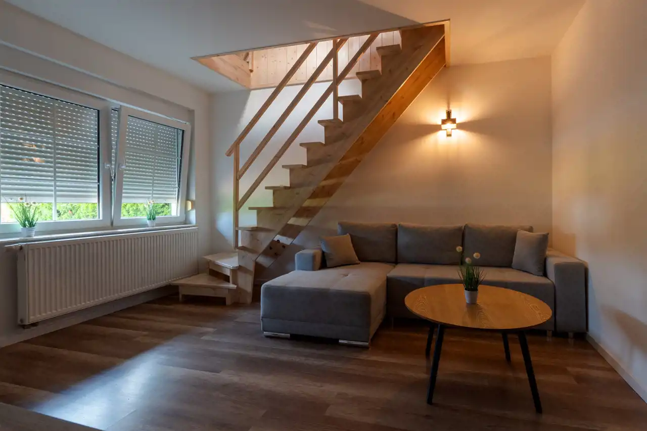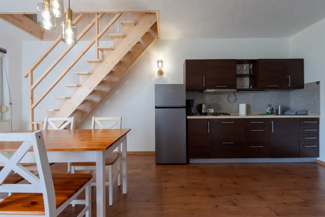 - 3 apartamenty dwupoziomowe aneksami kuchennymi i łazienkami – ok. 30 m2 każdy + poddasze, na którym znajduje się sypialnia,