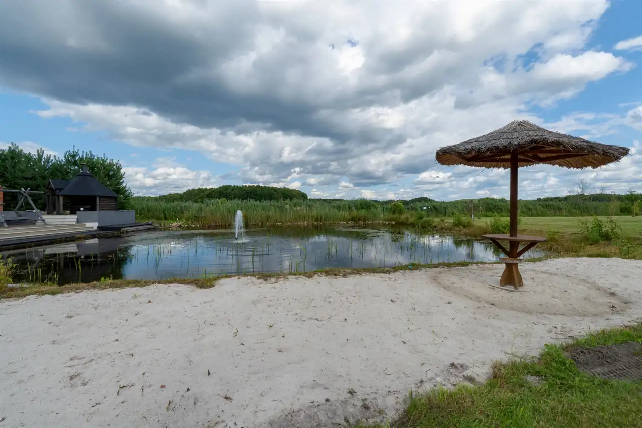 - Staw z fontanną - otoczony z jednej strony plażą z białym piaskiem i trzcinowymi parasolami, a z drugiej tarasem, tworzy harmonijną przestrzeń wypoczynkową. Staw posiada potencjał, by w przyszłości połączyć go z jeziorem, tworząc kameralną przystań.