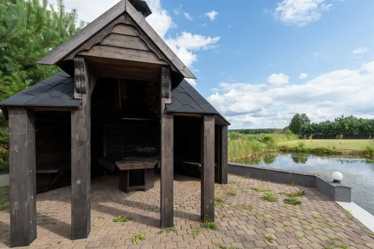 - Zadaszona wiata grillowa, wędzarnia oraz palenisko na ognisko – idealna przestrzeń do spotkań towarzyskich i relaksu na świeżym powietrzu.