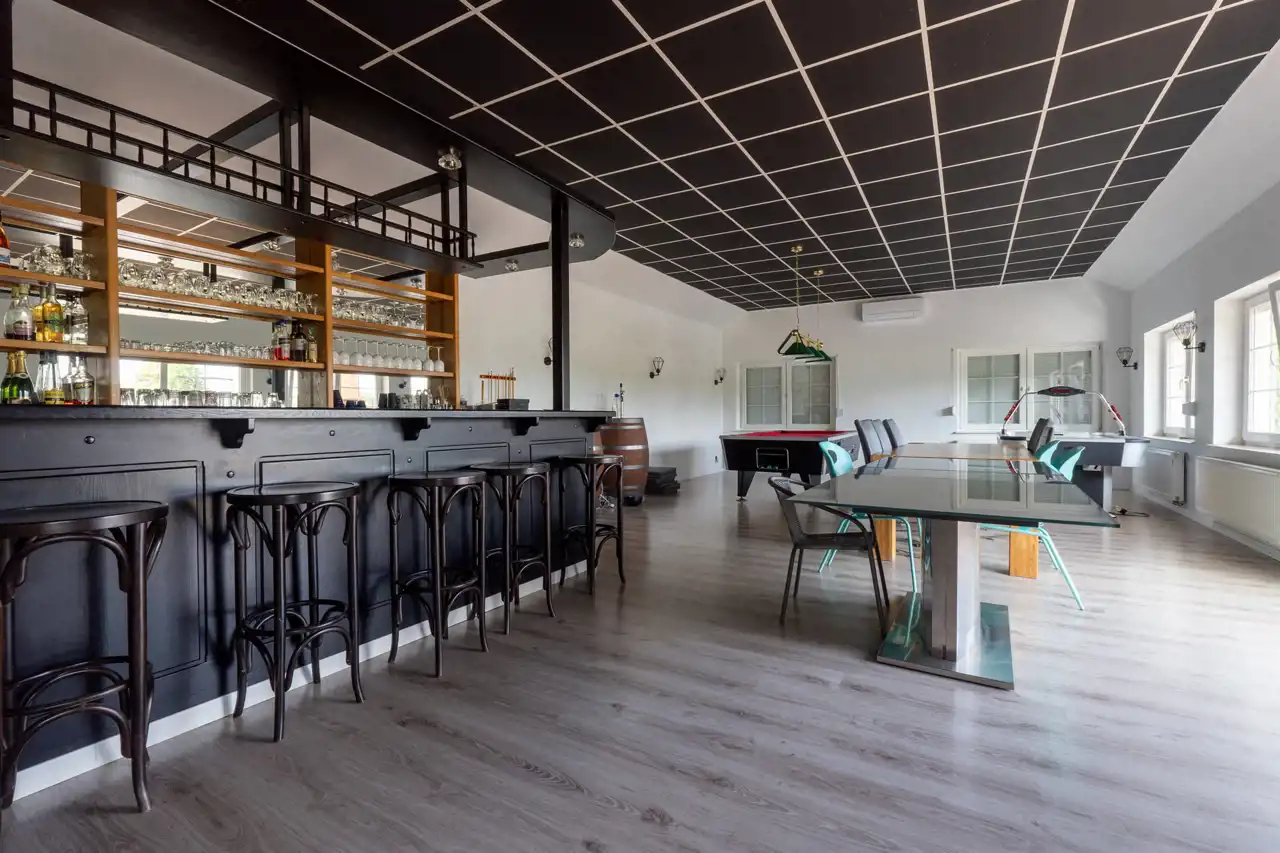 - przestronna sala i barem pełniąca również funkcję sali bilardowej z wc – ok. 85 m2 oraz dużym tarasem,