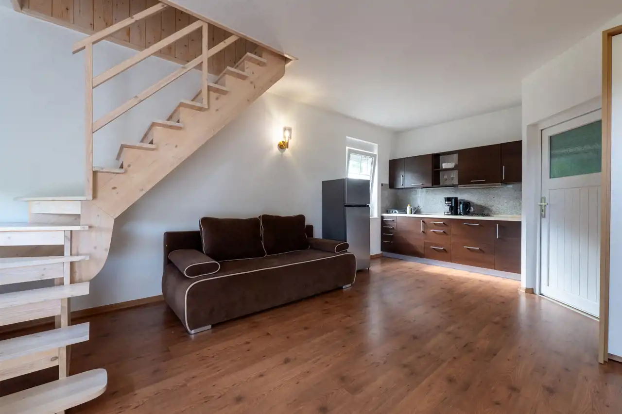 - 3 apartamenty dwupoziomowe aneksami kuchennymi i łazienkami – ok. 30 m2 każdy + poddasze, na którym znajduje się sypialnia,