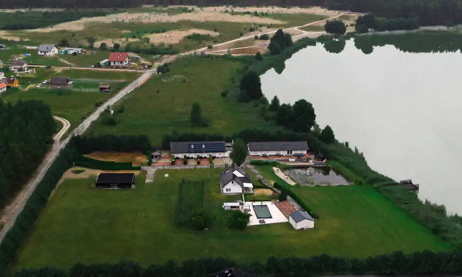 - Działka 13 000 m² z bezpośrednim dostępem do jeziora dopuszczonego do kąpieli i sportów wodnych.