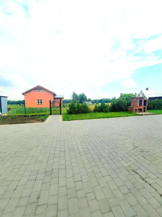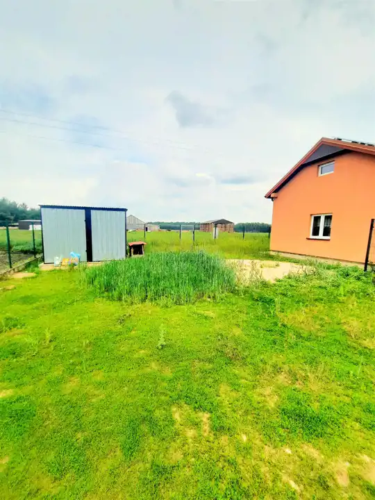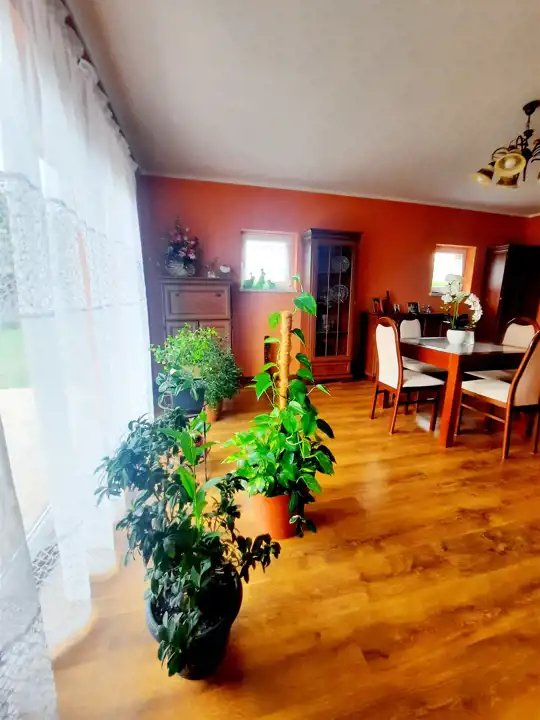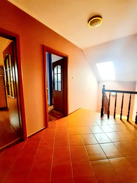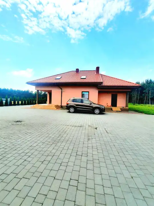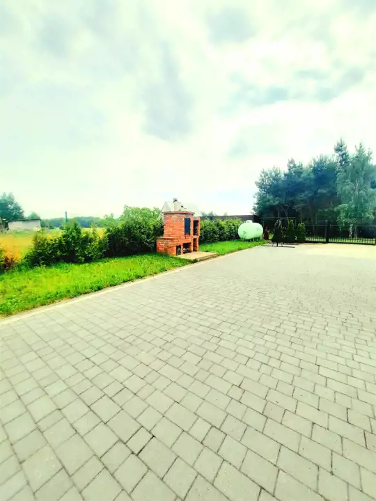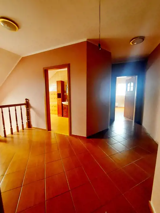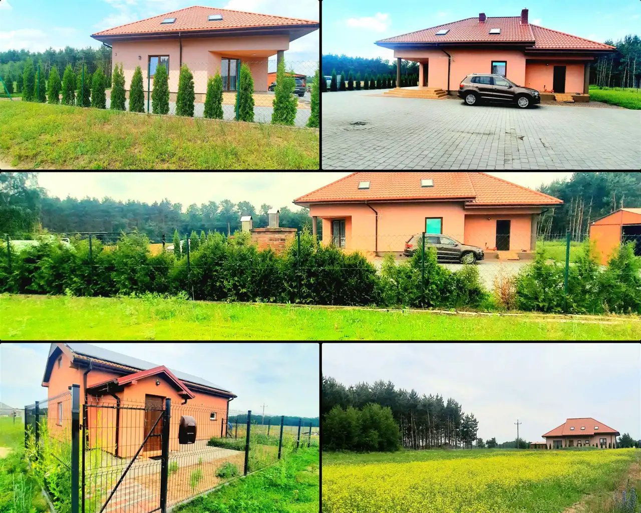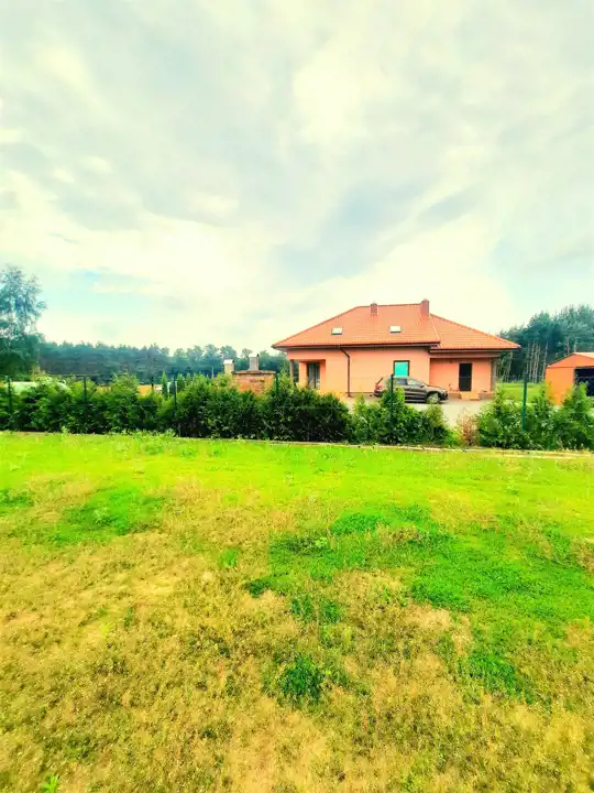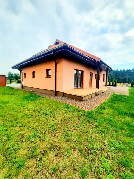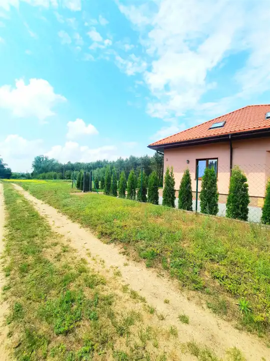 Budynek parterowy z użytkowym poddaszem o powierzchni całkowitej ok 150 m2. Parter składa się z: korytarza , bardzo przestronnej kuchni z jadalnią oraz salonem z wyjściem na duży taras z którego rozciąga się przepiękny widok na pola i lasy , 2 sypialni , przedpokoju ,kotłowni, łazienki z prysznicem oraz WC. Na poddaszu znajdują się 3 sypialnie , ogromna pralnia z suszarnią ( możliwość adaptacji na duża sypialnie bądz siłownię), łazienka z wanną oraz garderoba. Dom ogrzewany jest piecem miałowym oraz gazem , na dachu budynku gospodarczego zainstalowano penele fotowoltaiczne co zapewni Państwu bardzo niskie rachunki za energię elektryczną ( ok 35 zł/msc). w oknach zainstalowano automatyczne rolety antywłamaniowe.