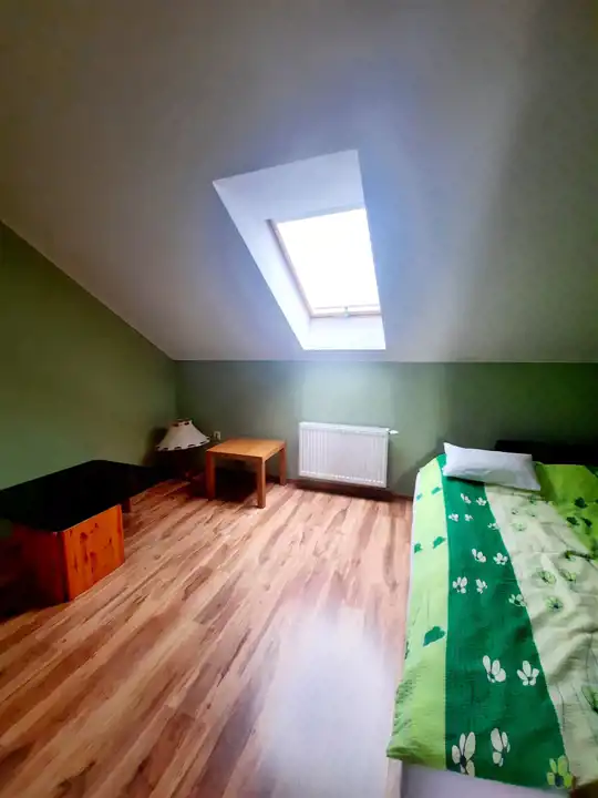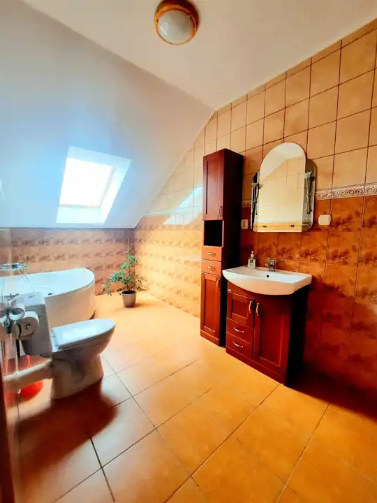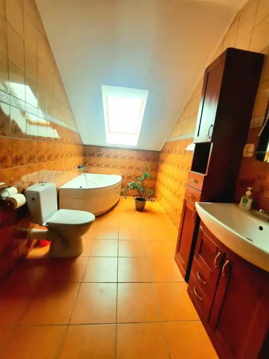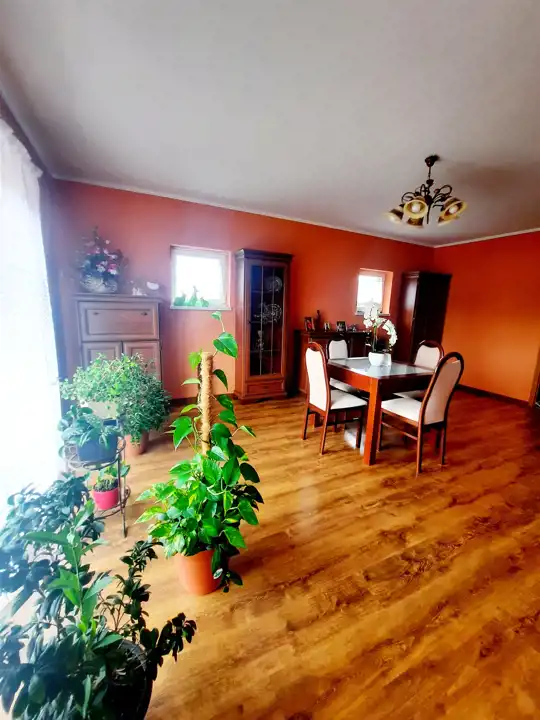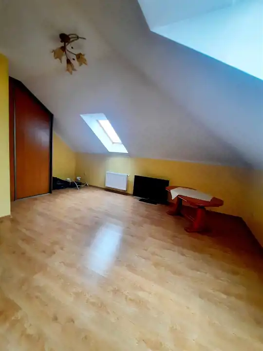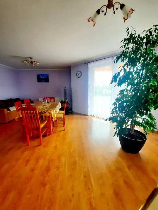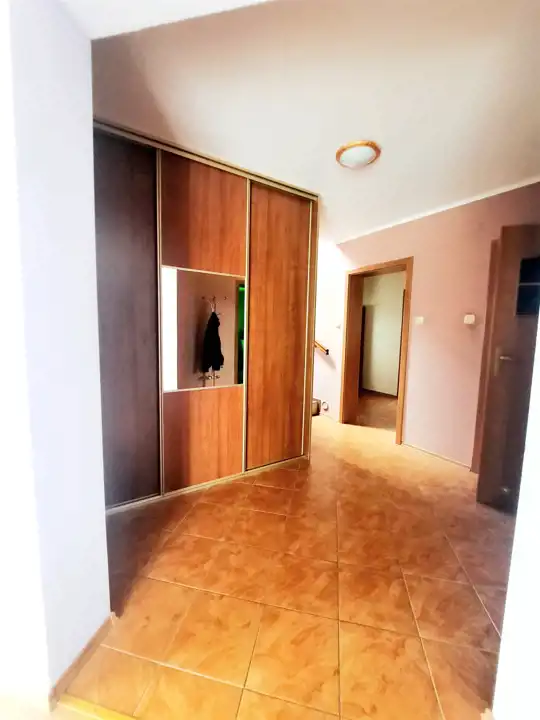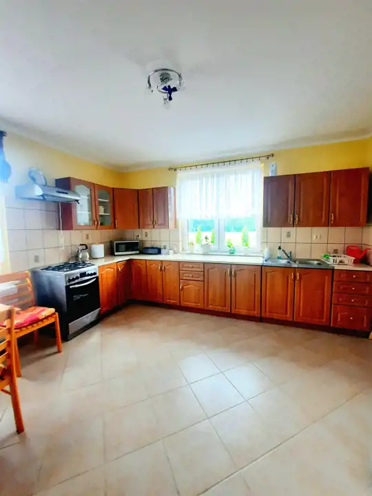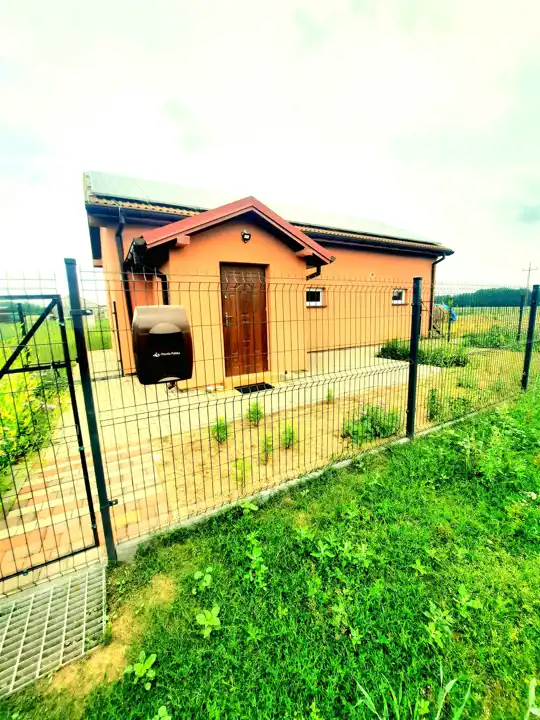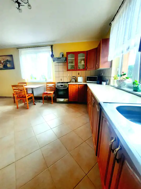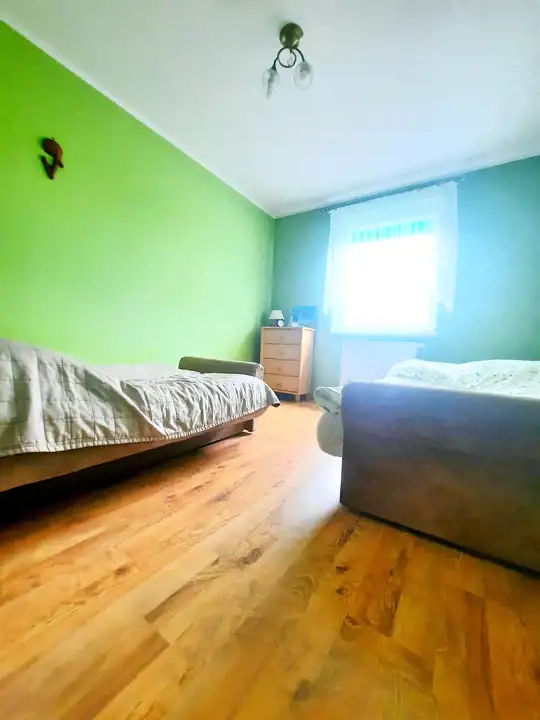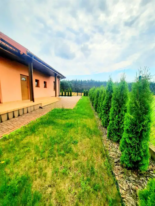 Budynek parterowy z użytkowym poddaszem o powierzchni całkowitej ok 150 m2. Parter składa się z: korytarza , bardzo przestronnej kuchni z jadalnią oraz salonem z wyjściem na duży taras z którego rozciąga się przepiękny widok na pola i lasy , 2 sypialni , przedpokoju ,kotłowni, łazienki z prysznicem oraz WC. Na poddaszu znajdują się 3 sypialnie , ogromna pralnia z suszarnią ( możliwość adaptacji na duża sypialnie bądz siłownię), łazienka z wanną oraz garderoba. Dom ogrzewany jest piecem miałowym oraz gazem , na dachu budynku gospodarczego zainstalowano penele fotowoltaiczne co zapewni Państwu bardzo niskie rachunki za energię elektryczną ( ok 35 zł/msc). w oknach zainstalowano automatyczne rolety antywłamaniowe.