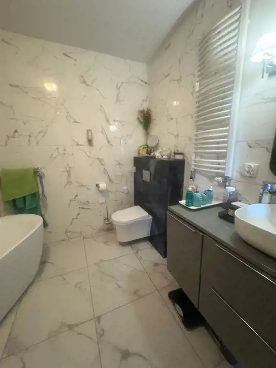 Parter: duży salon (ok. 32 m2 )z wyjściem na tarasik, osobna kuchnia ( 16m2), łazienka( 7m2) z kabiną prysznicową i wanną, toaleta z funkcją bidetu, duży holl i przedpokój z 5 szafami , w tym jedną typu Komandor