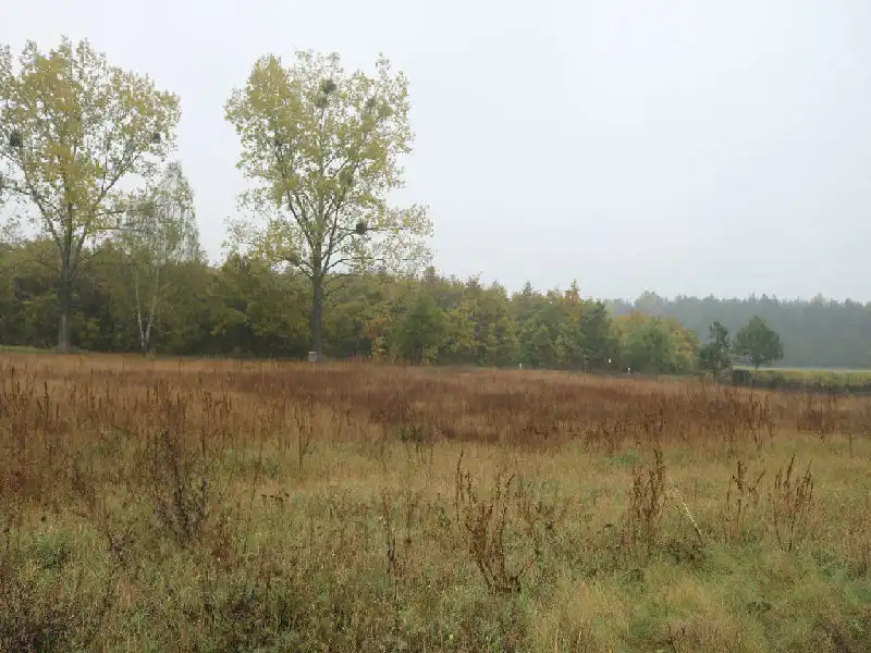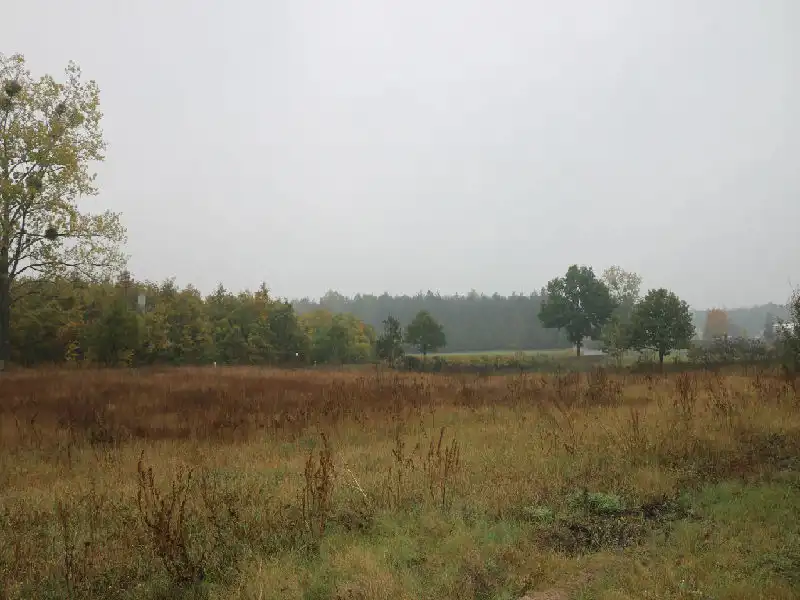 Działka sąsiadująca z zabudowaniami, lasami, łąkami i polami.