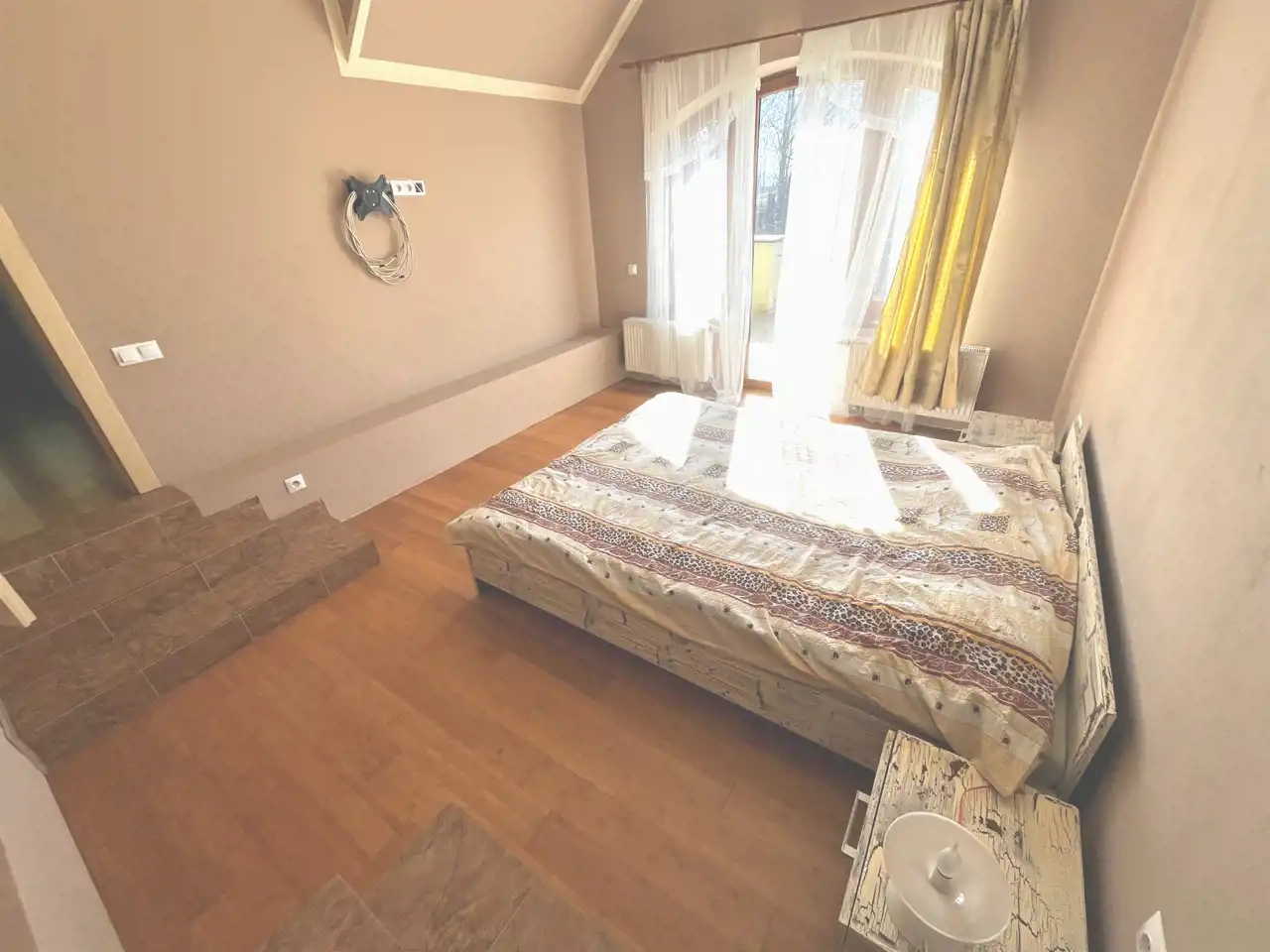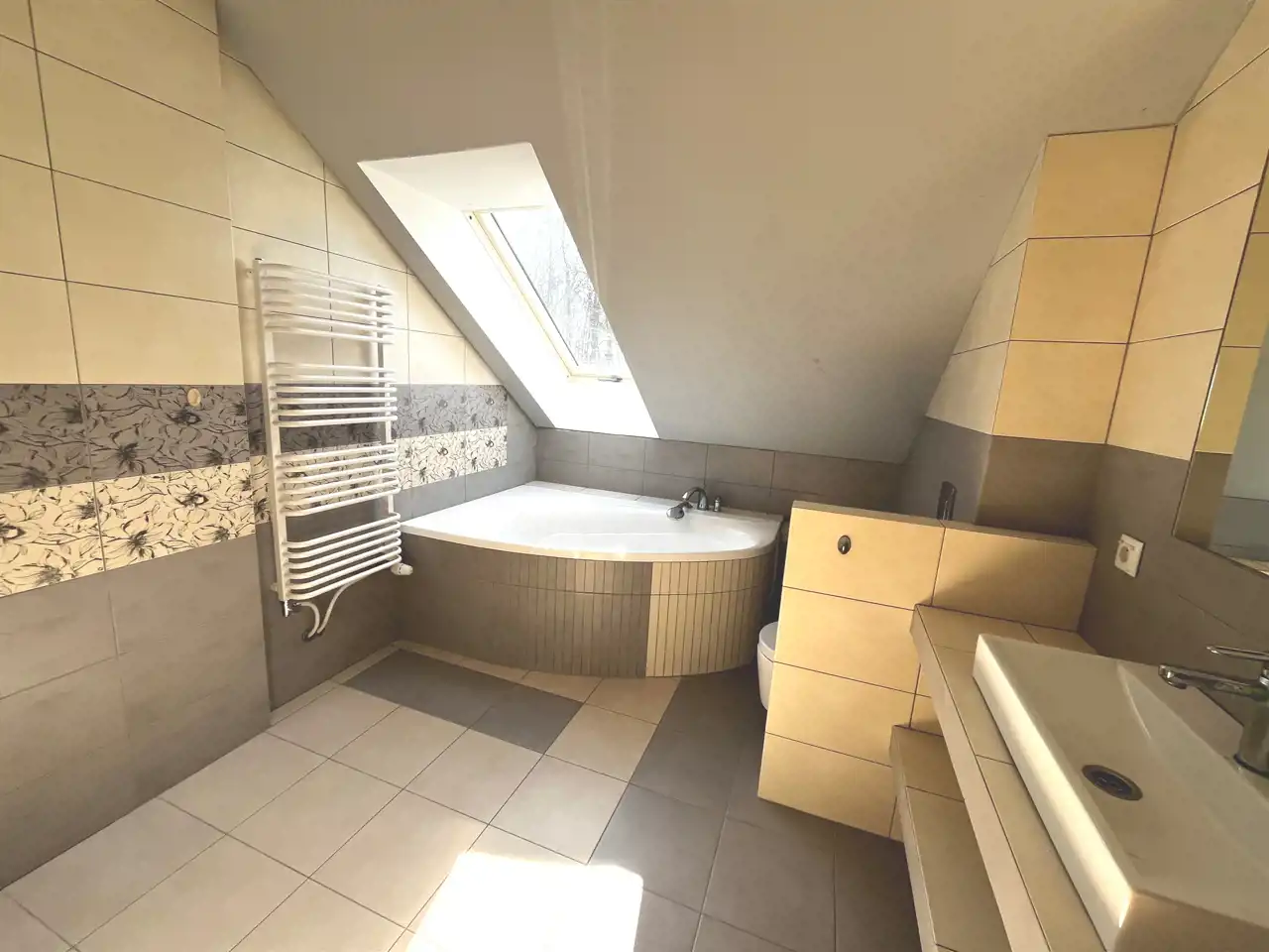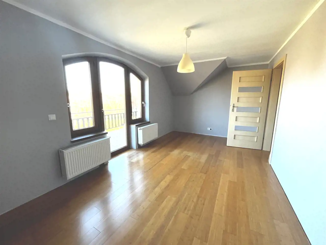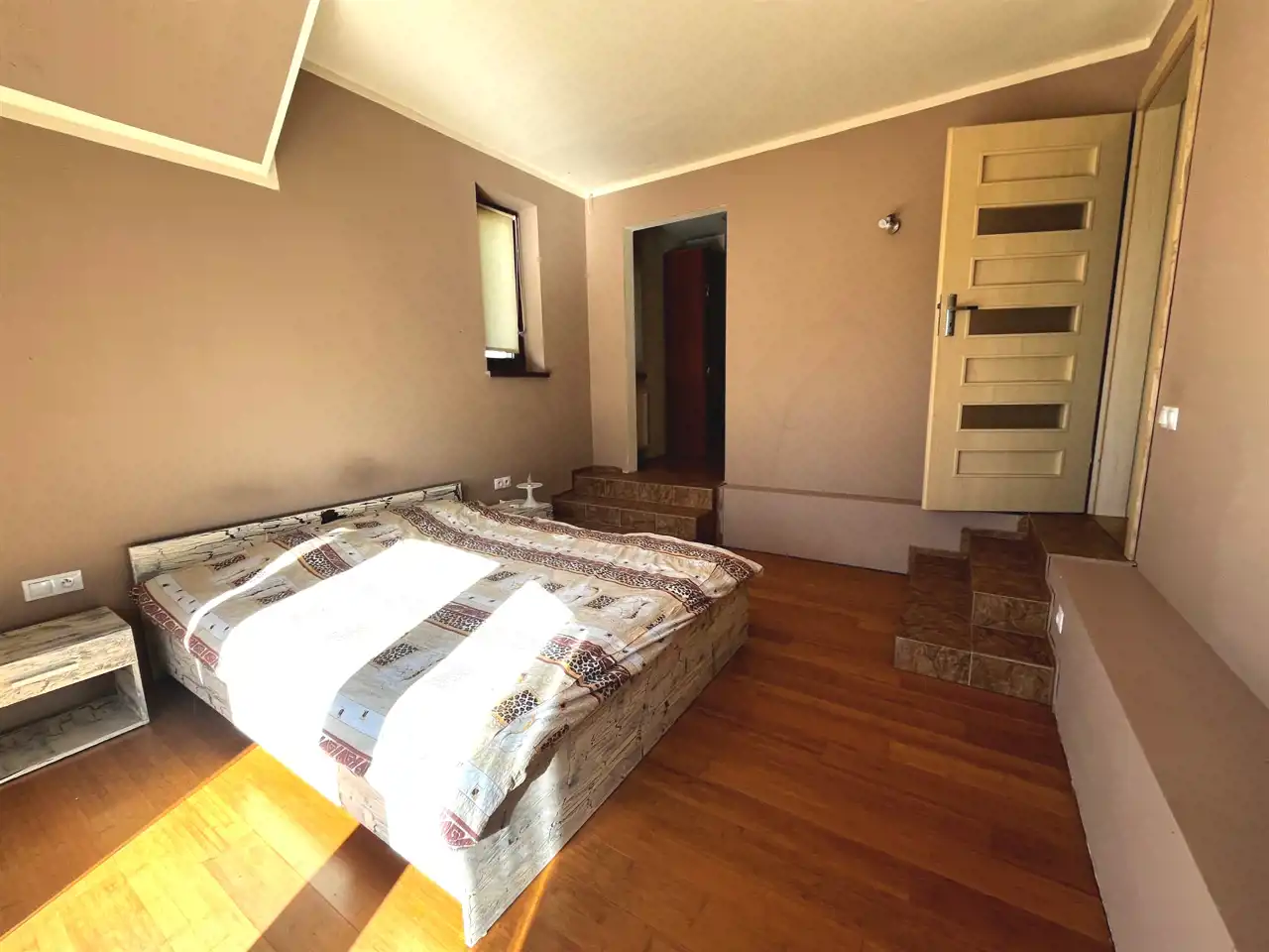 Na piętrze 4 sypialnie (2 z tarasem, 1 z garderobą), oraz łazienka z wanną. Podłogi z deski bambusowej.