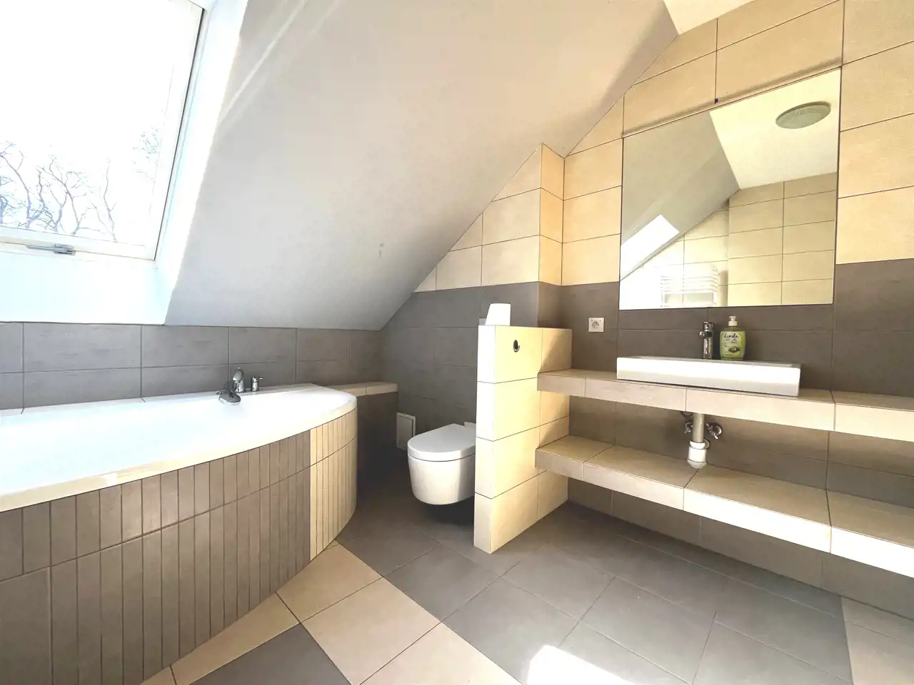 Na parterze duży około 26 m2 salon z wyjściem na ogród,, dodatkowy pokój, łazienka z prysznicem, oraz kuchnia. Ponadto z poziomu parteru przejście do garażu ( około 25 m2) .
