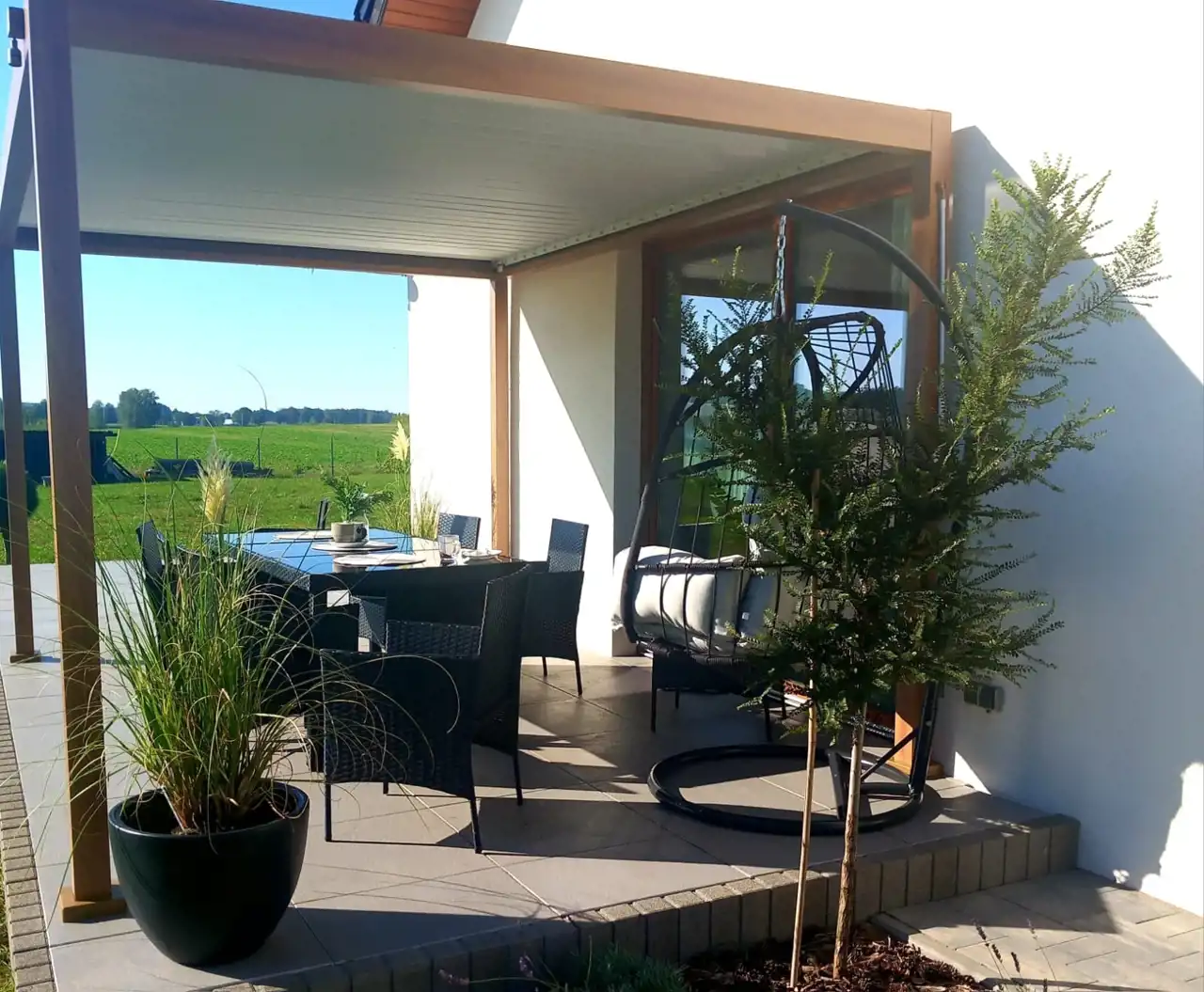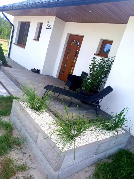 Z salonu prowadzi wyjście na duży taras - 53m2, wyłożony dobrej jakości gresem odpornym na zabrudzenia. Zadbana przestrzeń wokół domu, mnóstwo nasadzeń, chodnik wejściowy wyłożony kostką w kolorze melanż alpejski.