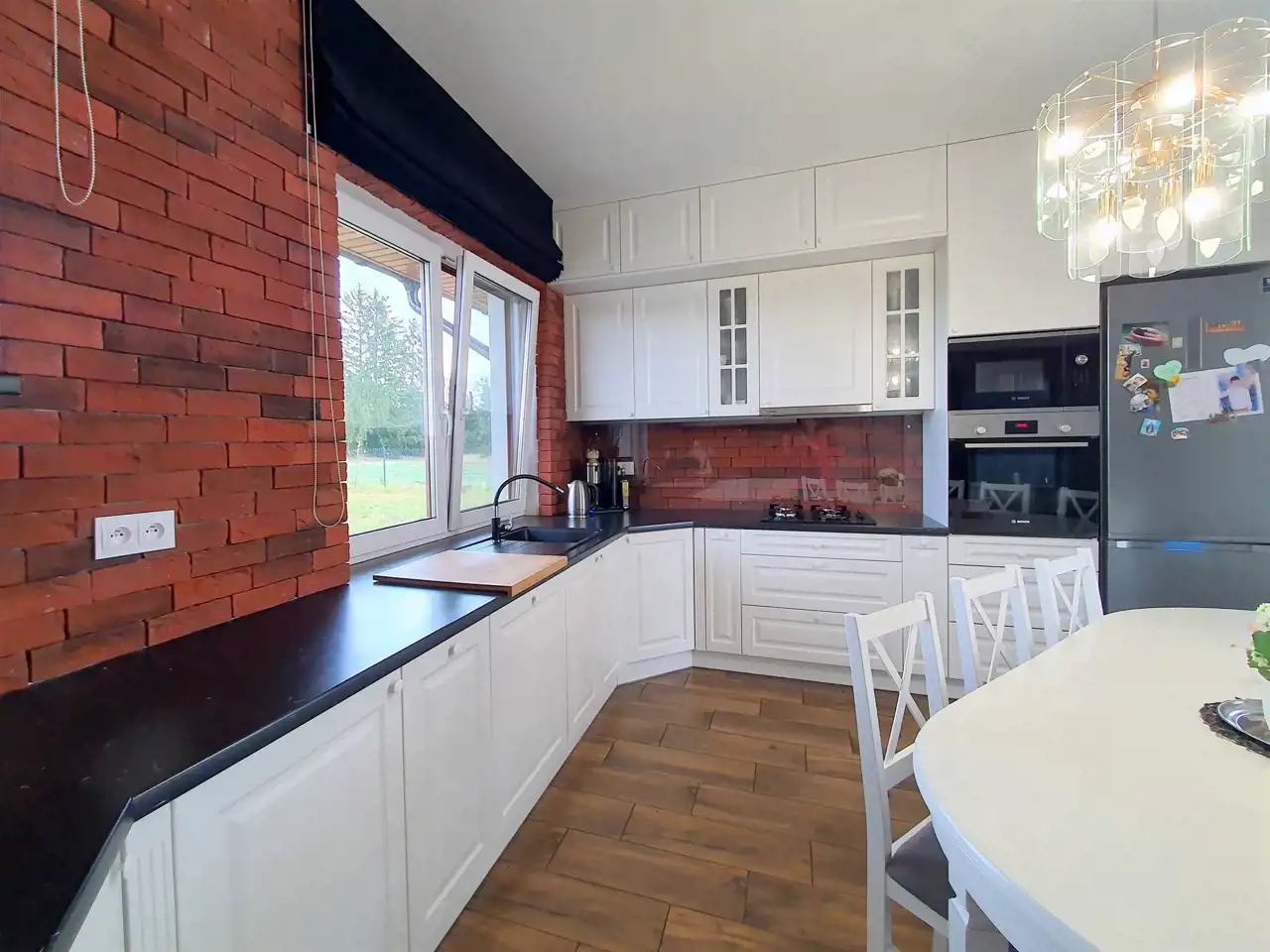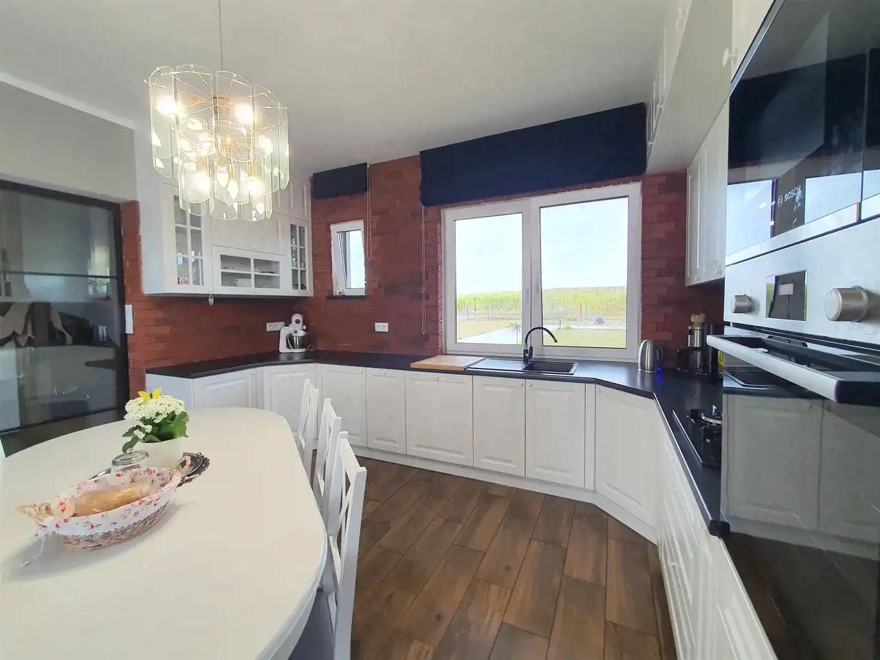 W kuchni elegancka zabudowa z MDF – lakier satyna, zawiasy Blum, sprzęt AGD w zabudowie: piekarnik, mikrofakówka, płyta gazowa Bosch, zmywarka Elektrolux 60cm, lodówka Samsung.
