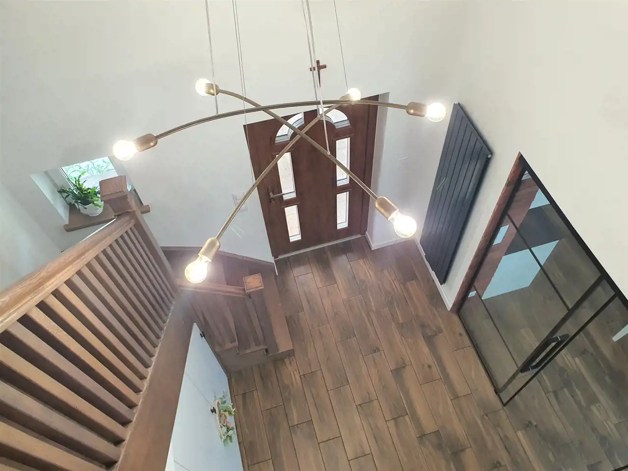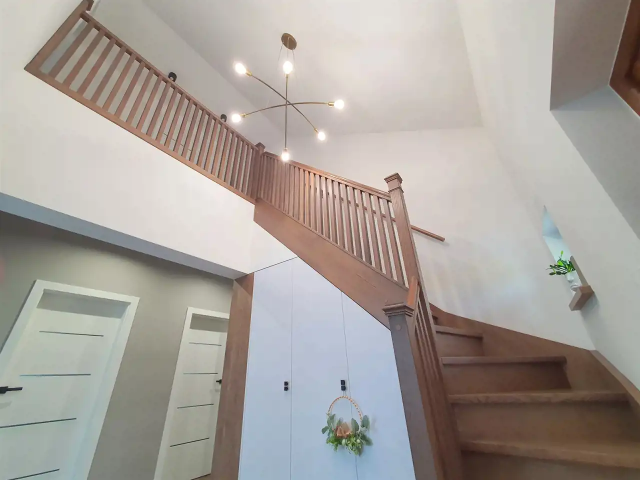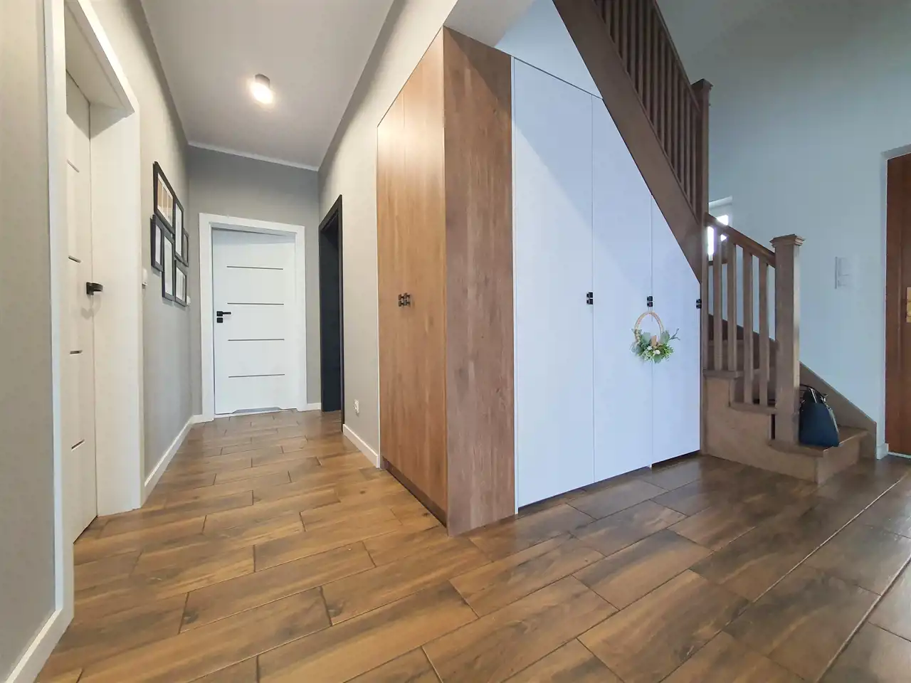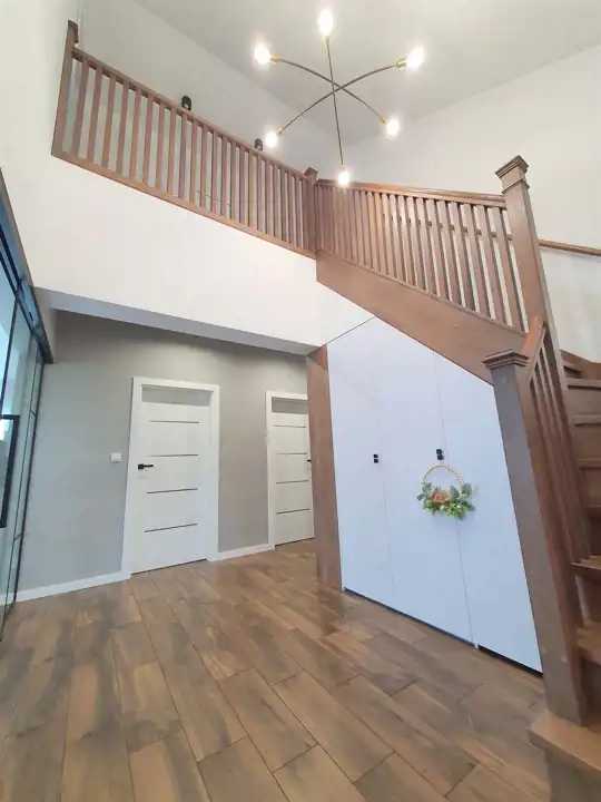 Wizytówką domu są piękne dębowe schody, prowadzące na piętro oraz efektowne przeszklenie oddzielające część dzienną od korytarza.