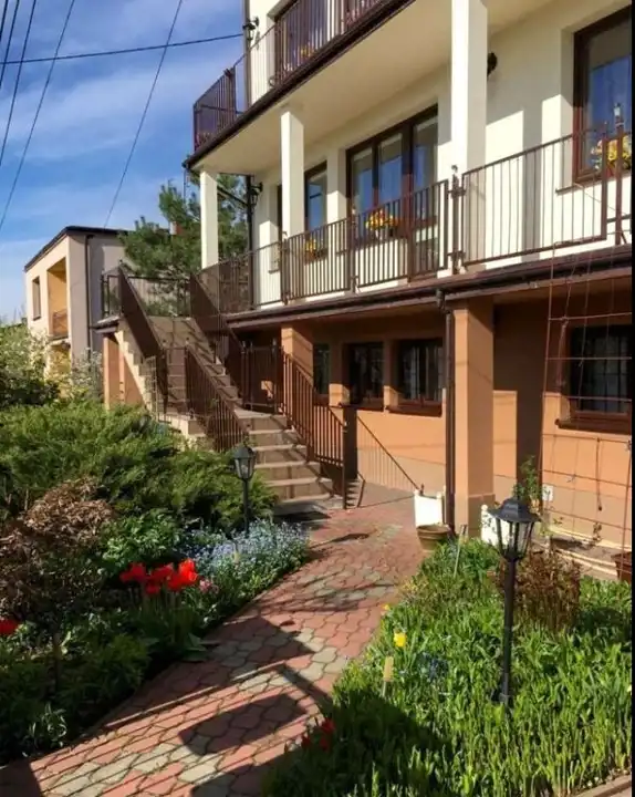 Dom spełnia warunki komfortu i niezależności dla dwóch rodzin. Klatka schodową w bloku, łączącą wszystkie 4 poziomy i stanowiącą osobne wejście z tejże klatki na poszczególną kondygnacje. Dom posiada dużo tarasów, w tym słoneczny taras o powierzchni 48 m2 nad garażem. Na tyłach domu znajduje się podjazd dla kilku samochodów i oddzielony ogród w którym rośnie wiele drzew owocowych i ozdobnych.