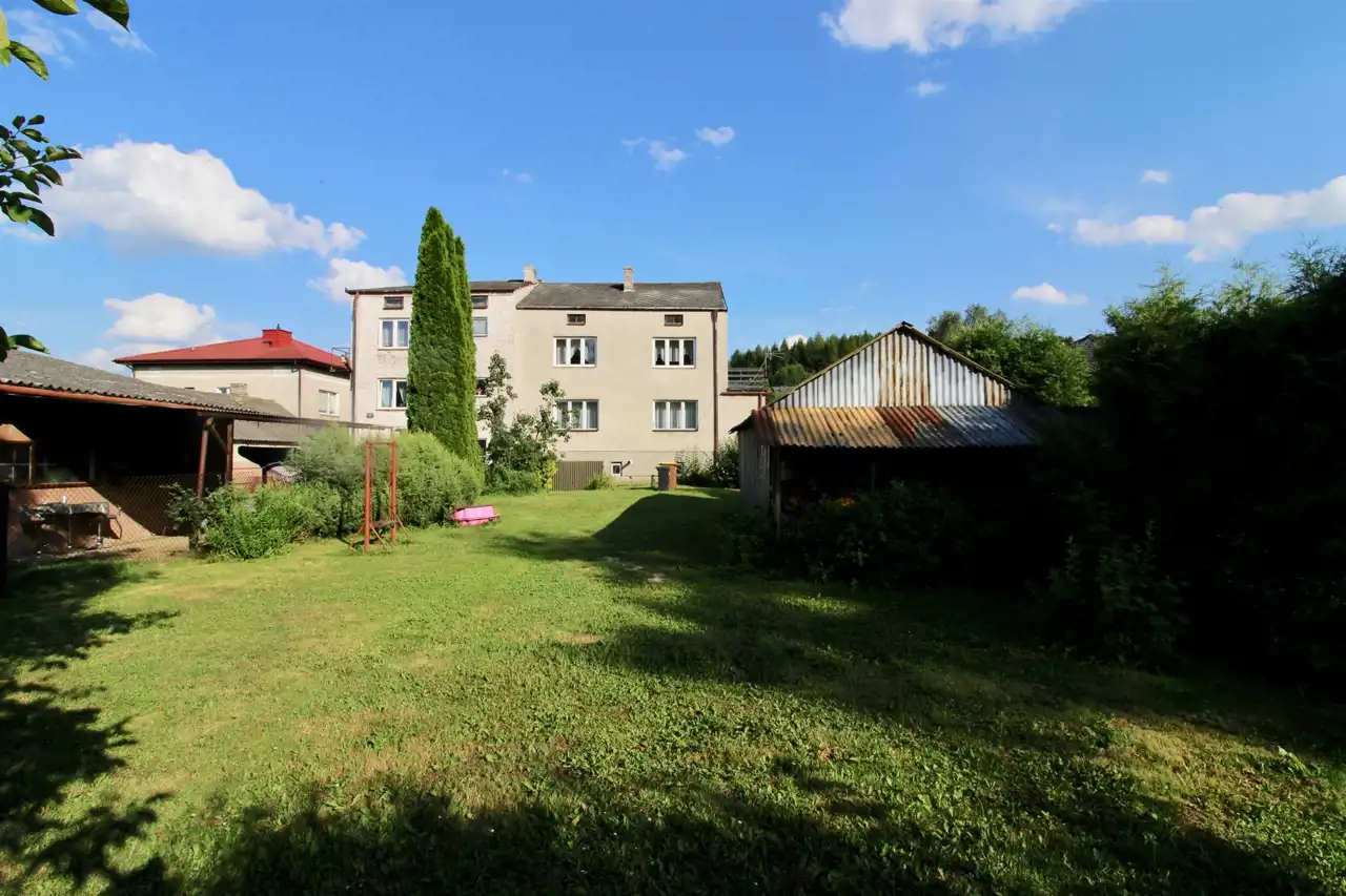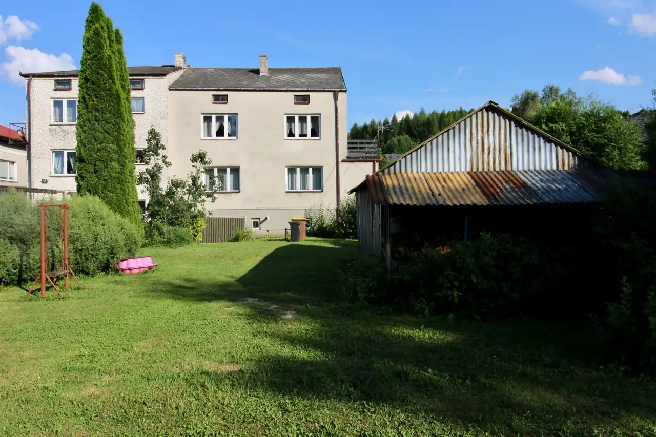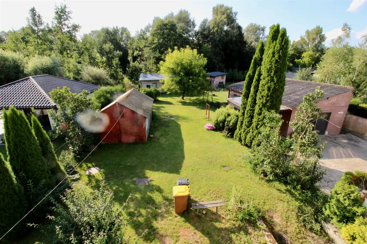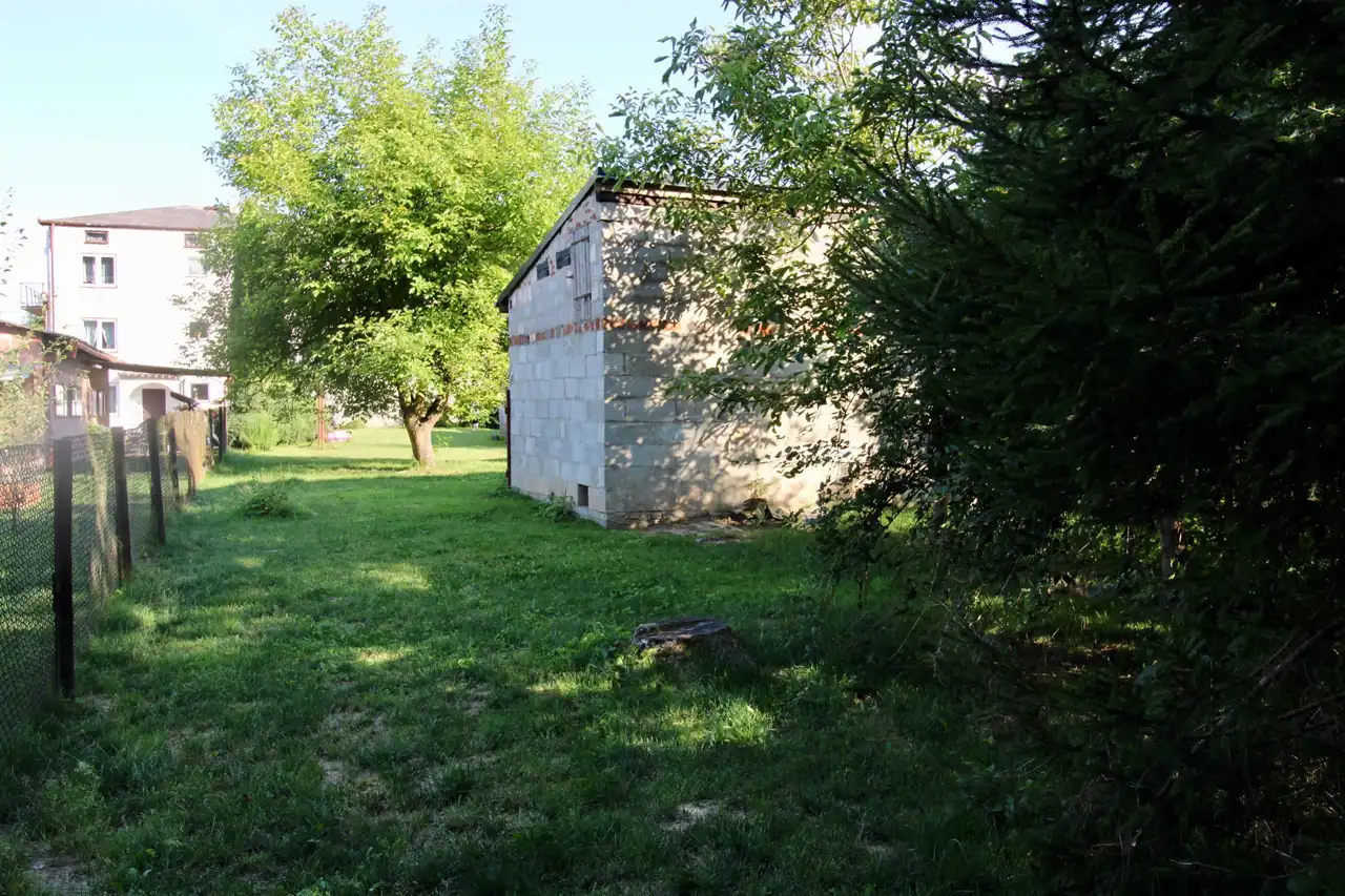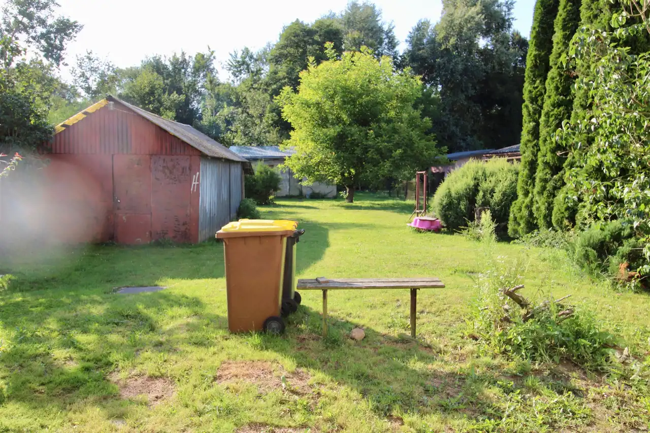Po za garażem w bryle budynku drugi garaż blaszak na posesji, na działce także budynek gospodarczy murowany, działka graniczy na końcu z małym strumykiem, do którego prowadzi furtka w ogrodzeniu.