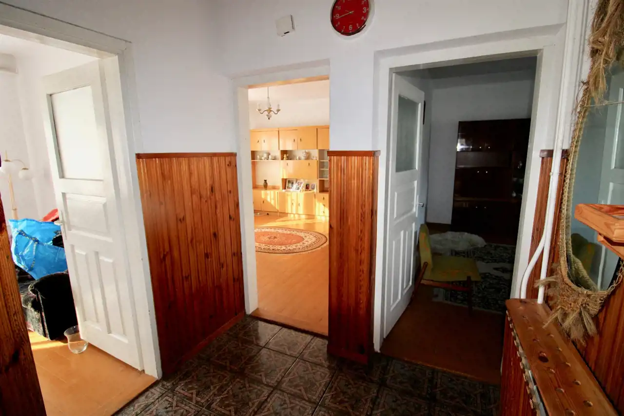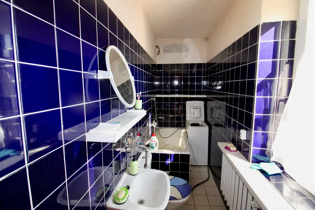 W łazienkach i kuchni glazura i terakota starszego typu, podłogi z desek sosnowych, drzwi wewnętrzne stary typ.