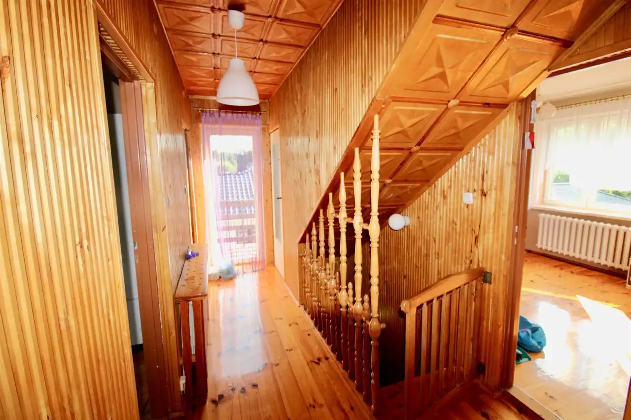 Pierwsze piętro to kuchnia, salon, 2 pokoje, łazienka, na drugim piętrze 3 sypialnie i łazienka.