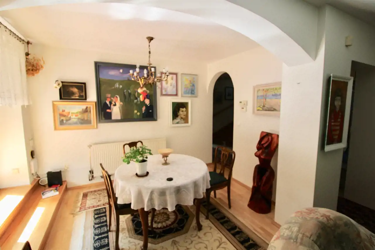Po przekroczeniu progu okazuje się, że jest to dom utrzymany w pięknym stylu reprezentującym styl niekonwencjonalnych wnętrz, wzbogaconych łukowymi zwieńczeniami salonu i jadalni, pozwalającym stąpać po lśniących podłogach z klepki bukowej, wznosić się na piętro po bukowych schodach. Podłogi pierwszego piętra stanowią wzorzyste deski sosnowe. Unikatowy klimat domu wypełniają artystyczne obrazy oraz gustownie dobrane meble.
