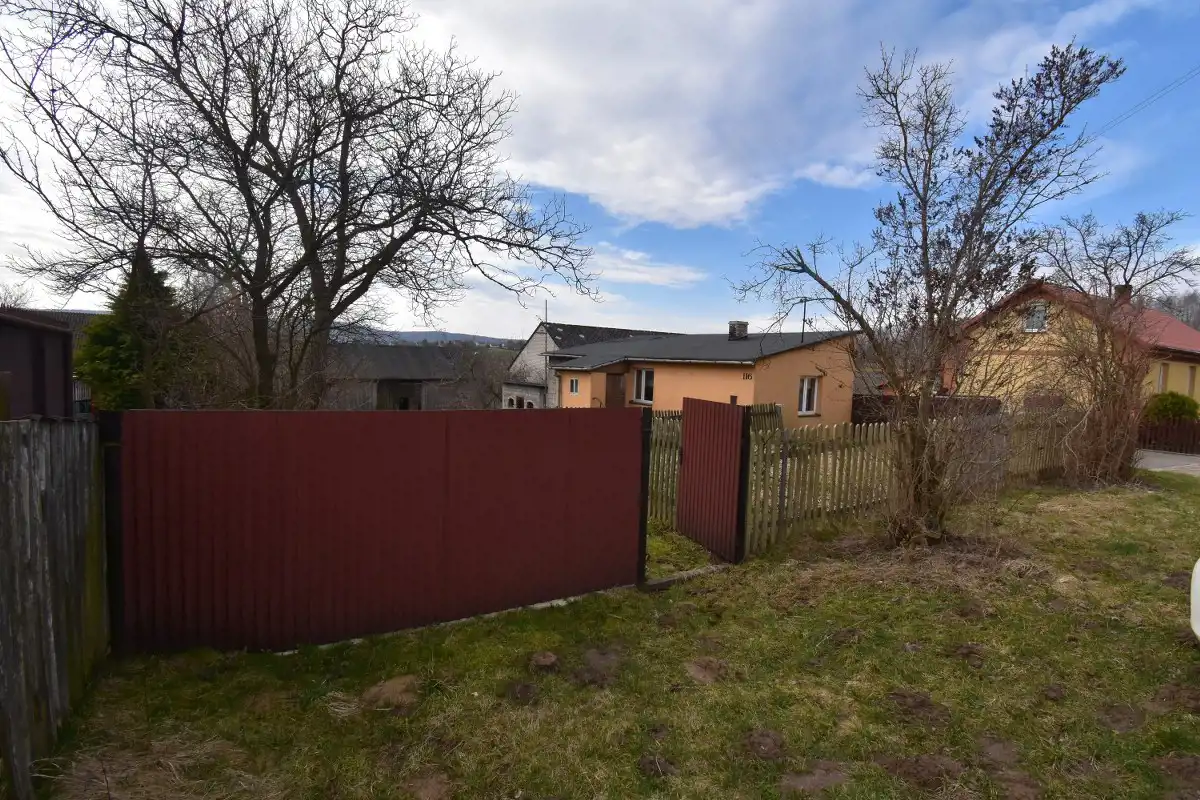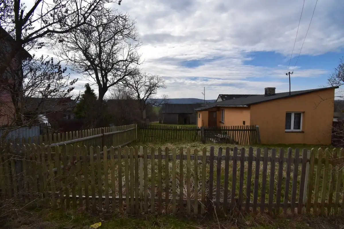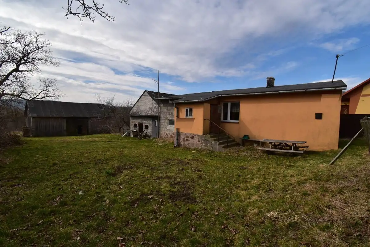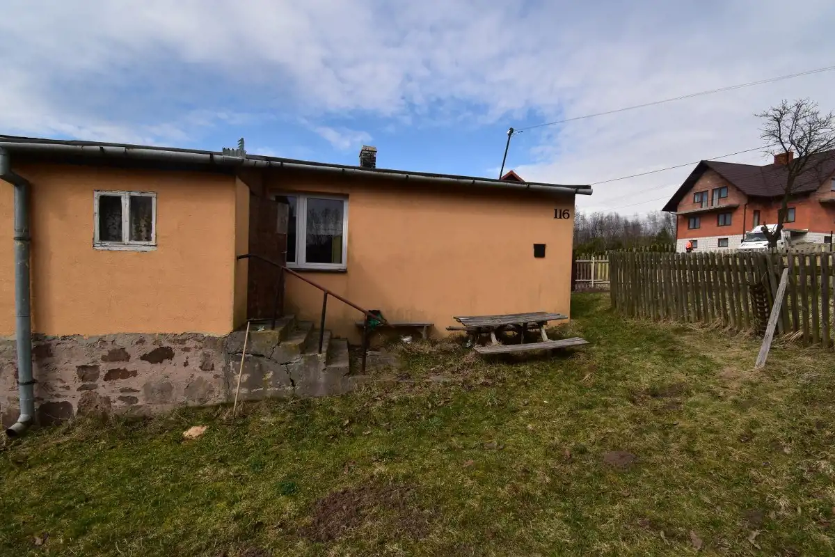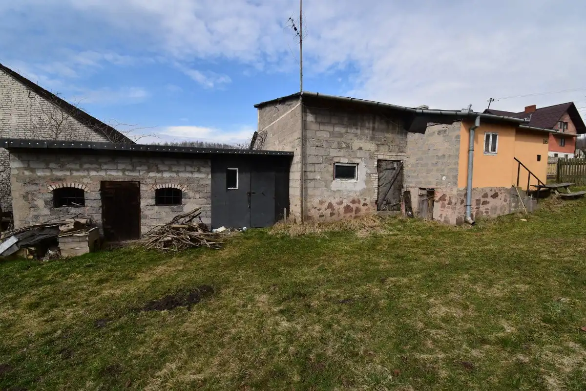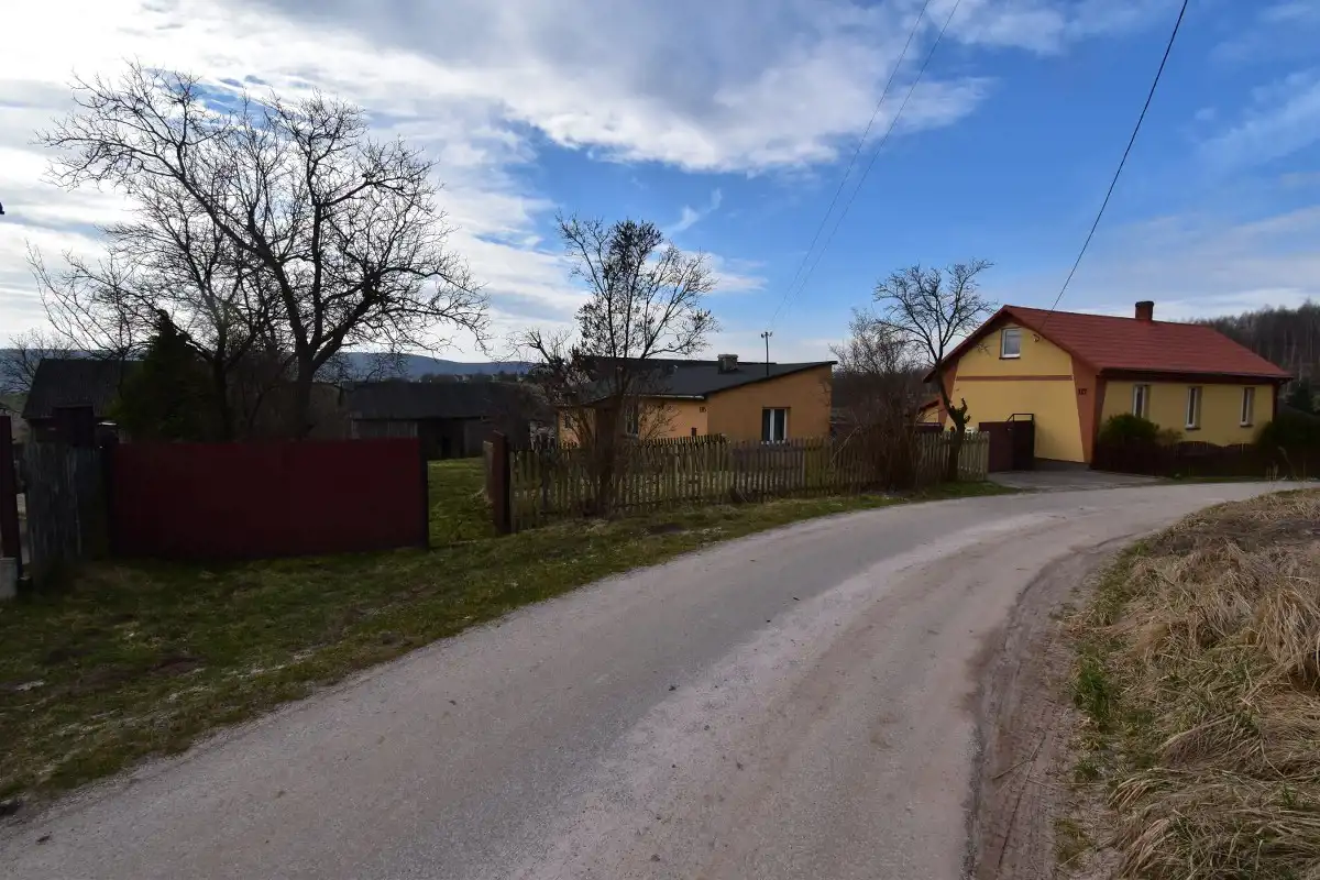 1. Działka o pow. 11 700 m2 (1,17 ha): zabudowana domem o pow. ok. 50 m2 oraz budynkami gospodarczymi i stodołą o pow. ok. 100 m2. Dom z lat 70, murowany, w stanie do rozbiórki. Stodoła drewniana, z jednej strony murowana. Kształt działki zbliżony do trapezu.