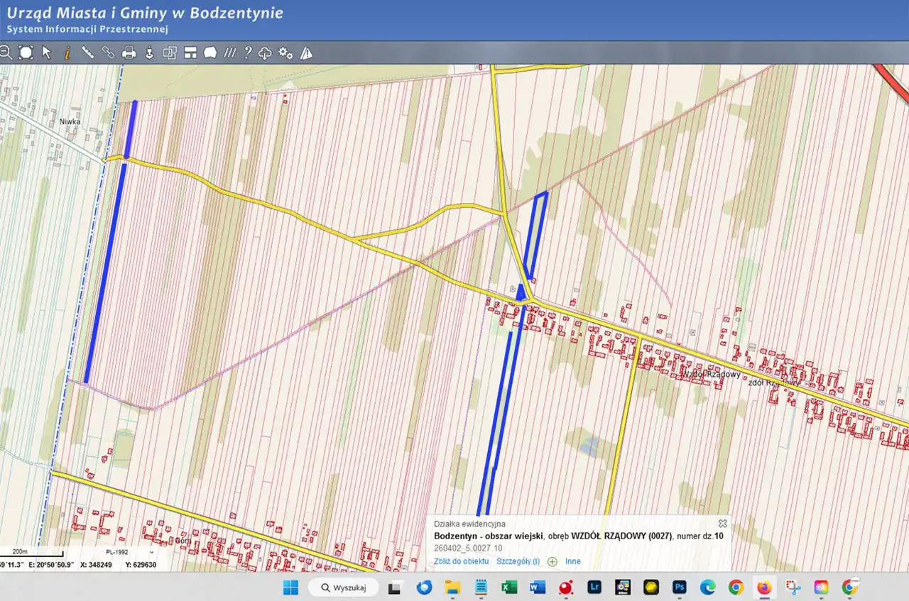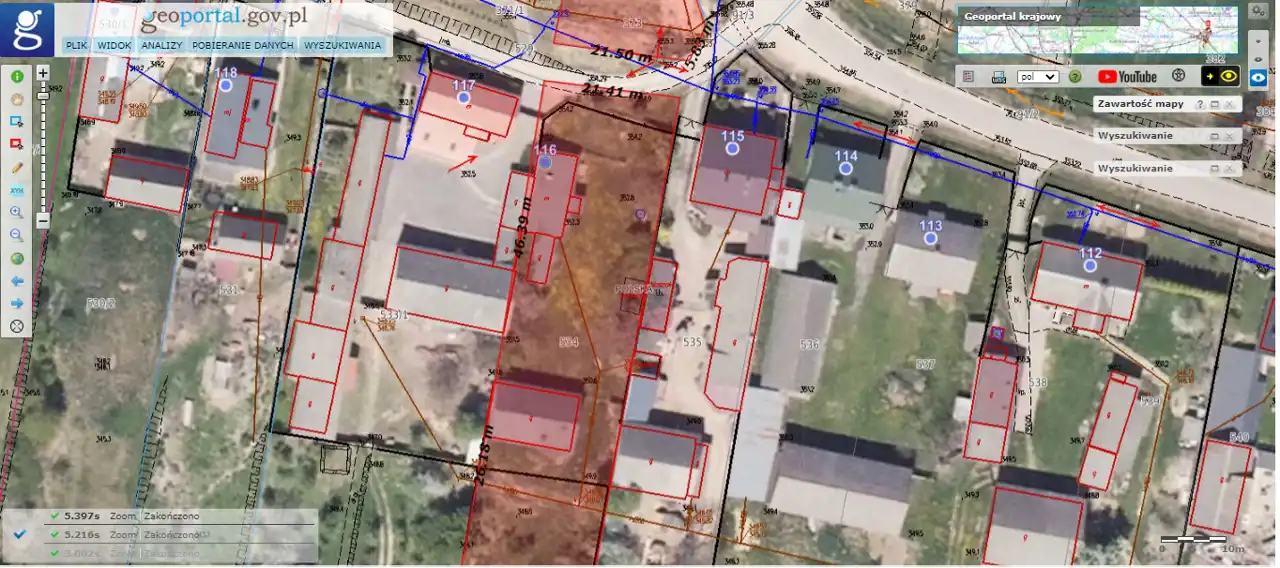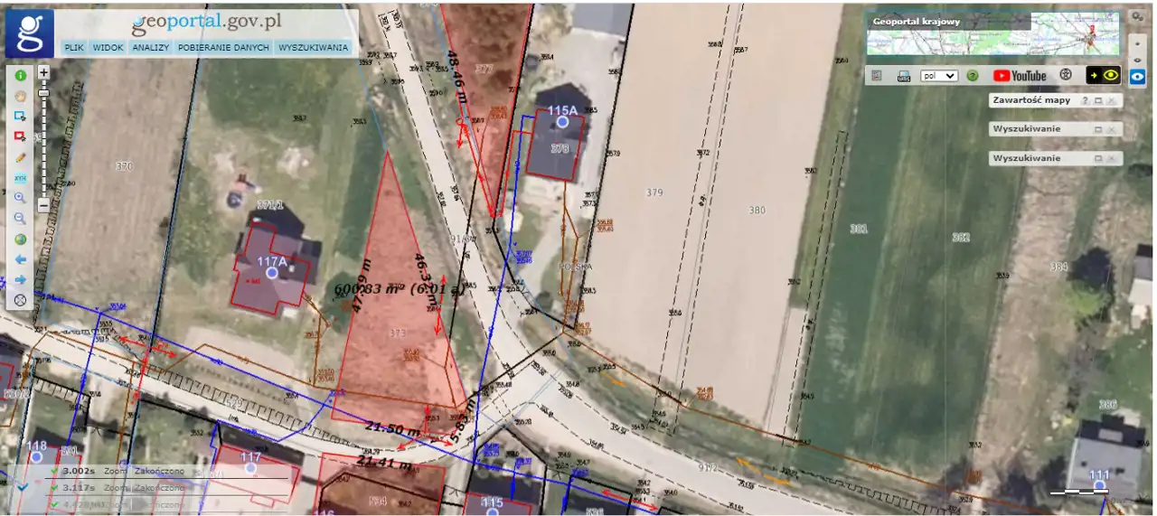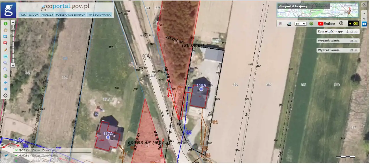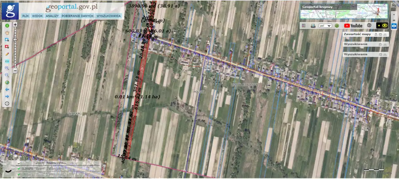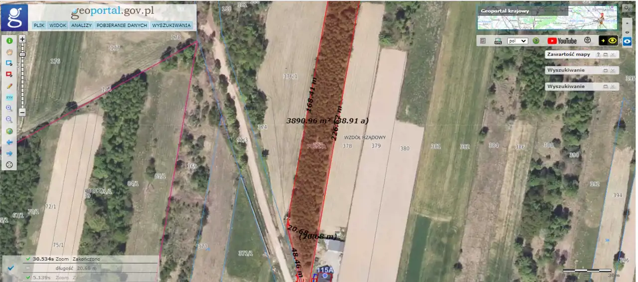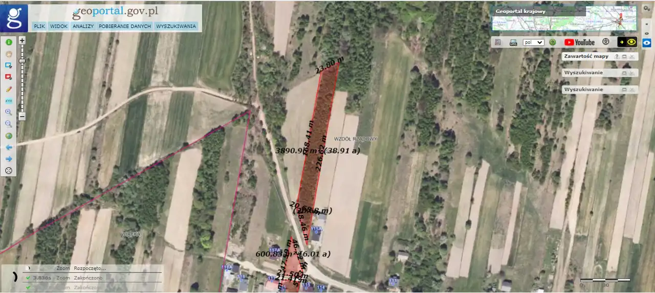 2. Działka o pow. 3789 m2: wymiary (w przybliżeniu): 19,5 m x 226 x 22 m x 168 m. Działka w kształcie trapezu.