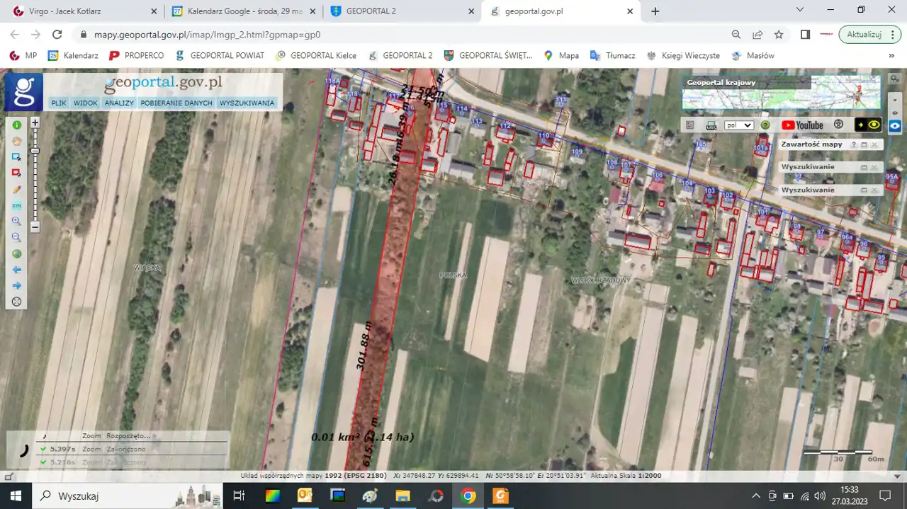 Wymiary działki (w przybliżeniu): 21,4 m (szer. od frontu) x 615 m x 15 x 615 m.